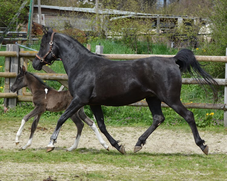 Nuestro Lopez sabe exactamente lo hermoso que es y lo demuestra, pero también es muy sociable y tranquilo. Es un hermoso caballo de color tobiano, lo que significa que lleva además del gen Tobiano un Frame Overo, pudiendo transmitir estos dos genes de forma conjunta o individual. Lamentablemente, en nuestro establo está relacionado con casi todas las yeguas, y esa es la razón por la cual no podemos quedárnoslo nosotros mismos. Fue premiado con una puntuación de 8,75, lo que indica un rendimiento excelente, destacando especialmente en tipo y movimiento. Actualmente, todavía parece un poco más oscuro, pero ya se puede ver claramente que es un verdadero caballo tobiano negro. Tanto su padre como el padre de la madre fueron importados de EE. UU., por lo que probablemente sea de sangre pura en la mayoría de los otros criadores. Su padre, Secret Legacy, fue distinguido como semental de alto rendimiento debido a su excelente prueba de rendimiento y, hasta ahora, su descendencia se muestra muy dócil, equilibrada y apta para la monta.