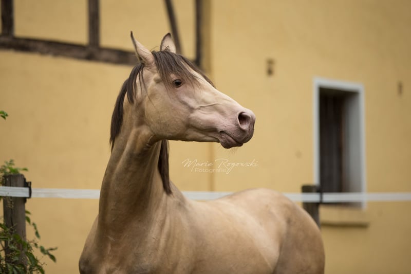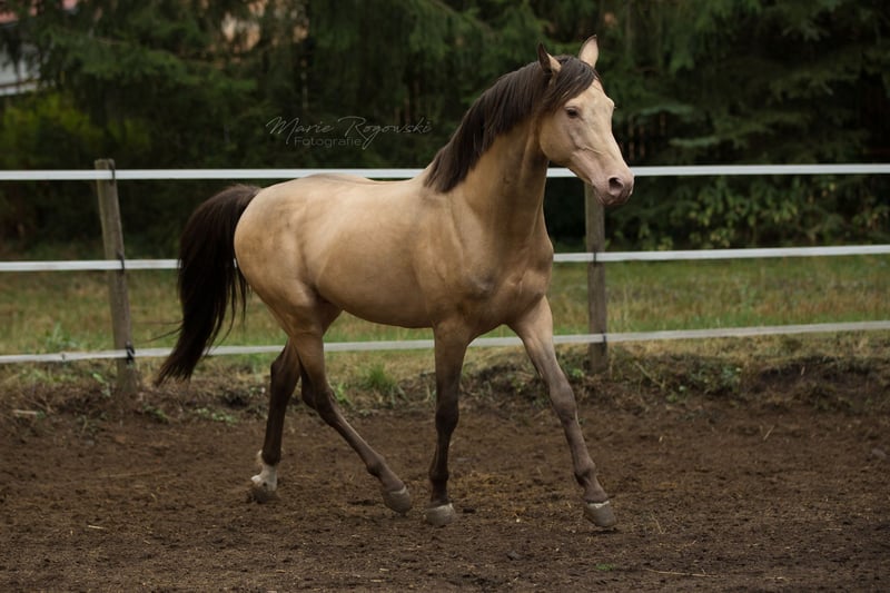 Partbred arabe | Amber Champagne | 2005 | 148 cm 87,5 % de sang arabe | Approuvé par l'ECHA-ESV (8,1 – HB I) Test de performance des étalons de 30 jours 2014, Neustadt/Dosse Génétique de la couleur : EE Aa Ch/n Testé génétiquement : SCID, CA, WFFS et PSSM2 – négatif Khalvados GF est un étalon compact, sportif, avec une rare robe ambre champagne et une forte proportion de sang pur. Il est sociable au quotidien, clair dans sa tête et facile à monter. Sa volonté de performance et son caractère amical ont été notés à plusieurs reprises 8,0 lors du test de performance des étalons. Du côté paternel, il descend de Khalvin Khlein KpM, le premier étalon arabe champagne approuvé au niveau mondial. Sa mère Muhida, une fille AV noire de jais issue du Hägerhof, apporte des lignées performantes via El Aswad et Farouk. Son pedigree combine des lignées égyptiennes, polonaises et américaines éprouvées avec un fort potentiel sportif et une grande diversité génétique. Khalvados GF est utilisé pour l'amélioration de l'élevage de poneys, de petits chevaux ou de chevaux part-bred. Sa descendance est présente dans le monde entier.