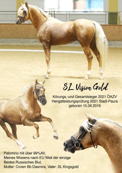 Körungs,-und Gesamtsieger 2021 ÖAZV Hengstleistungsprüfung 2021 Stadl-Paura geboren 15.06.2016 Palomino mit über 99%AV Meines Wissens nach EU Weit der einzige Bestes Russisches Blut SL Vision Gold ist ein sehr typstarker Hengst mit raumgreifenden Bewegungen und einem sehr korrekten Gebäude. Er hat eine sehr gute Abstammung die auf einige der besten russischen Leistungslinien zurück zu führen ist , was er mit seiner Rittigkeit widerspiegelt. Er konnte bei der Körung die Körkommision voll und ganz für sich Gewinnen & wurde Sieger seiner Klasse und Gesamtsieger der ÖAZV Körung ! Www.cwh-lindenhof.com