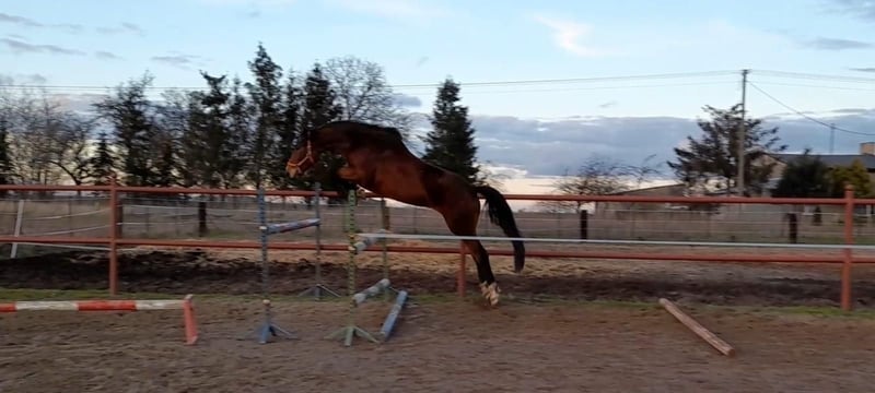 I am offering for sale a 9-year-old bay mare with strong sport potential and natural jumping ability. Height approx. 170 cm, well built, proportionate and dynamic in movement. Backed at the age of 6. She has been worked in the arena and in the field. At my place, she has been trained with focus on flatwork and pole work, improving balance, coordination and strength. She shows good understanding of the work and willingness to learn. Not overworked. She shows natural ability during free jumping – good technique and potential for further sport development or ambitious recreational riding. She is calm during transport, grooming and with the farrier. In the field she is confident, calm but alert – she observes new situations without panicking. Currently in light retraining / out of regular work. No history of injuries. Current veterinary examination (TÜV / vet check) possible at the buyer’s expense. Suitable for an ambitious rider who wants to further develop a horse in sport. The mare has had two foals. One can be seen on site. Price negotiable upon inspection. Horse is located in Poland.