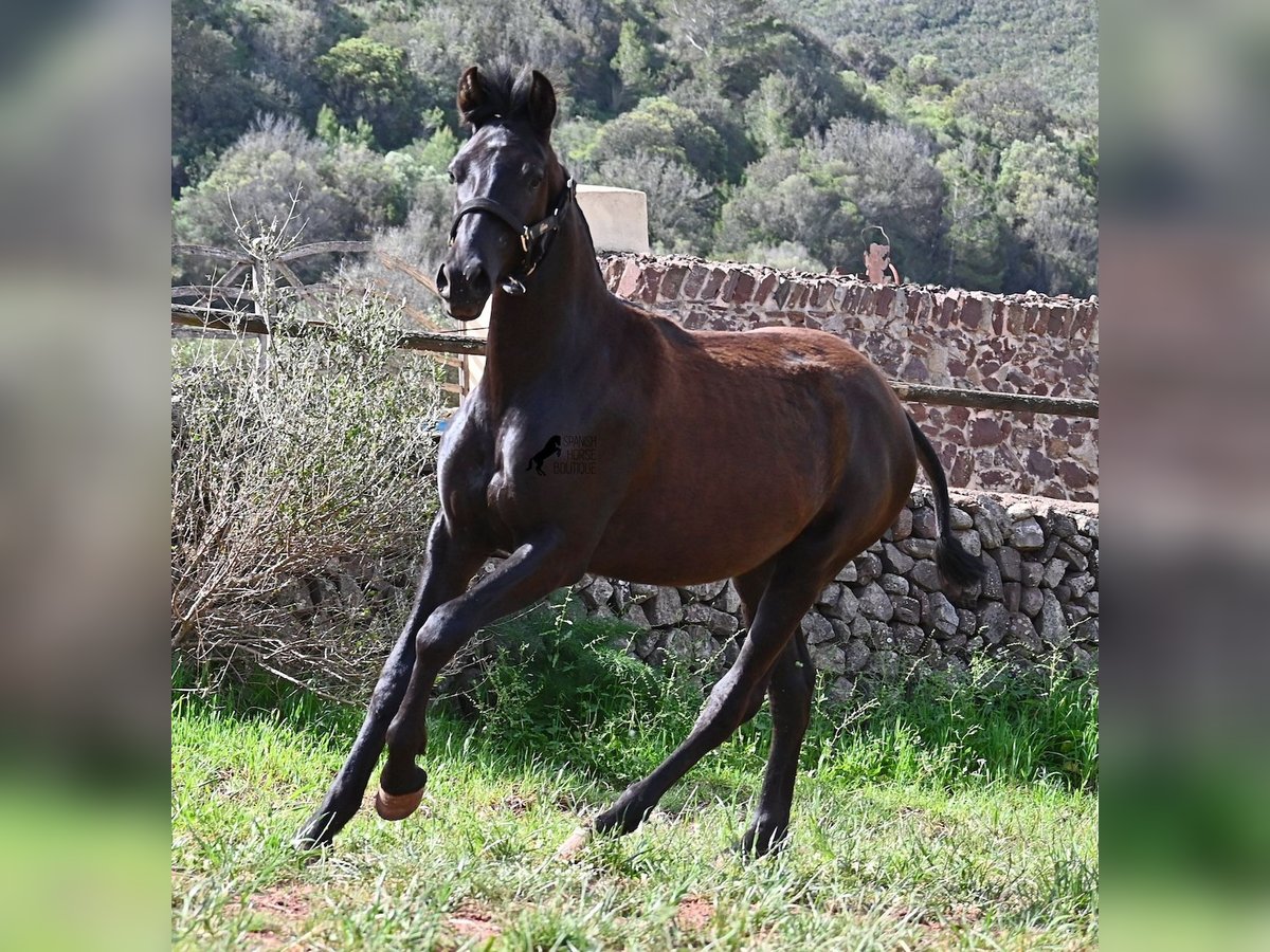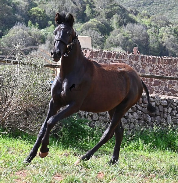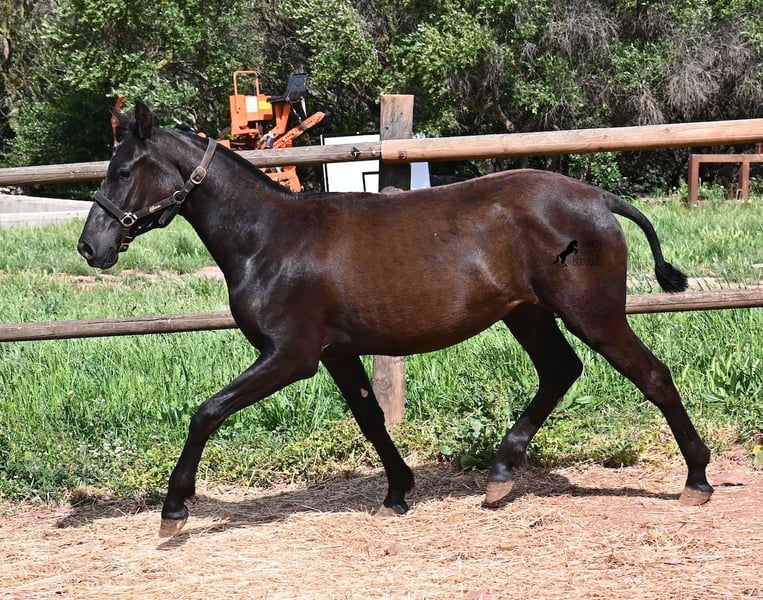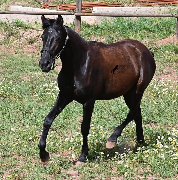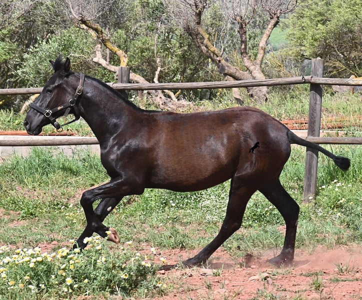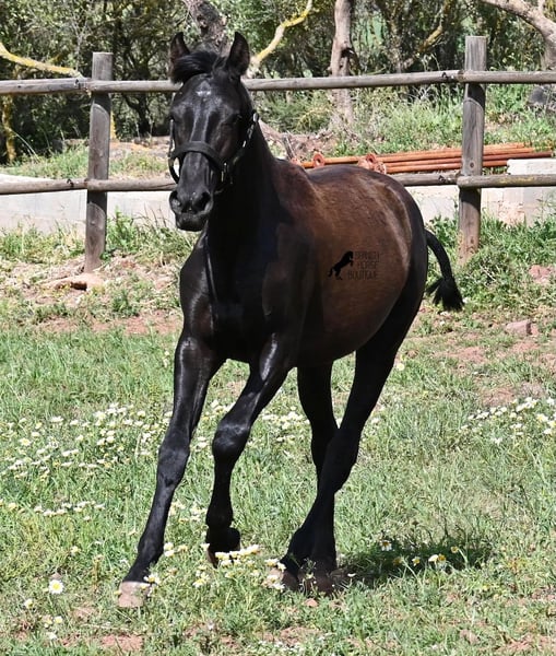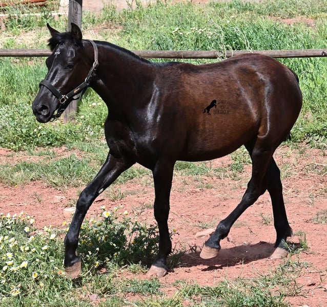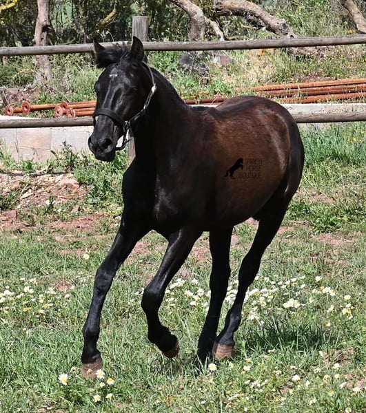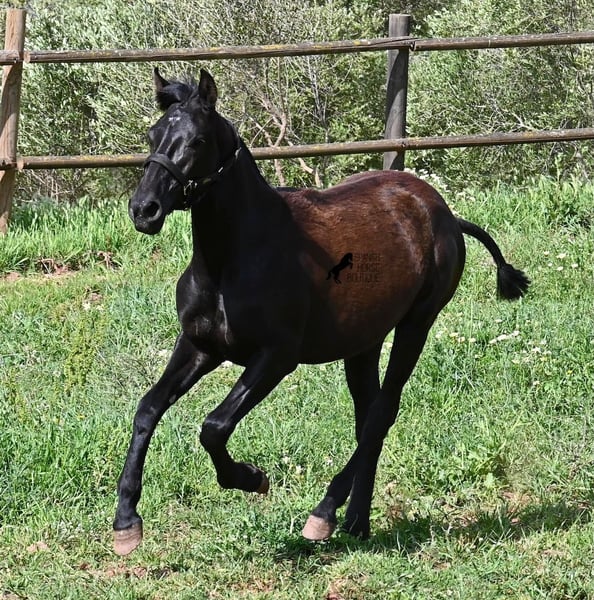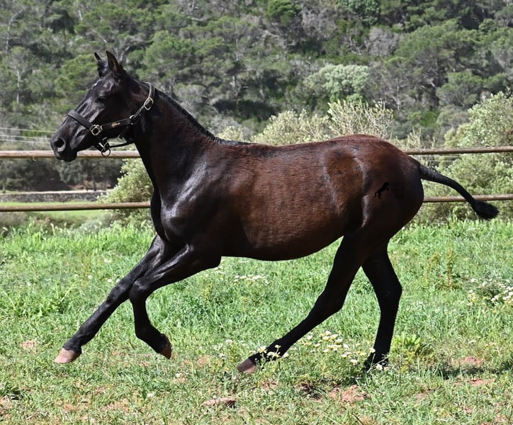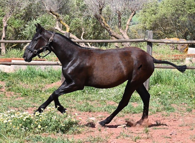 Diese 2025 geborene, reinrassige Menorquinstute, beweist, dass es in der Zucht vorkommt, dass vergangene Generationen stark durchschlagen können. Der Menorquin entstand, wie alle Rassen, aus einer Kombination mehrerer Rassen, bis ein festes Zuchtziel festgesetzt wurde. So ist der Araber viele Generationen im Hintergrund, doch wie man an dem Kopf und Exterieur dieser Stute sehen kann, kann er dennoch durchschlagen. Das macht sie für das heutige Bild des Menorquin eine echte Seltenheit. Allerdings bedeutet das auch, dass sie nicht unbedingt dem Zuchtziel entspricht und da wir auf Menorca traditionell Stuten nicht reiten und nur zur Zucht einsetzen, wird sie günstig für das heutige Preisfeld des Menorquin abgegeben, um einen Platz für sie als späteres Reit- oder Fahrpferd zu finden. In keinster Weise mindert das ihren Wert, es ist nur eine attraktive Gelegenheit für alle, die die Charakterzüge des Menorquin haben wollen, mit Mut, Klasse, Esprit und Ausdauer- zu einem "Schnäppchenpreis". Ihre Abstammung an sich ist beachtlich, denn sie ist die Tochter von einem der nur 3 Elitehengste der Rasse und auch mütterlicherseits finden wir gewichtige Tiere in der Abstammung. Also gute Qualität in exotischem Look :) Sie wird nicht allzu groß werden, um die 156cm und kompakt bleiben. Sie lebt in der Herde in 24h Robusthaltung, ist daher bestens sozialisiert und abgehärtet, dank des rauen Klimas auf Menorca. Man sieht auch an kleinen Macken, dass sich die älteren Stuten in der Herde gut um die Erziehung kümmern. Bis auf den Stern auf der Stirn ist sie komplett schwarz (tiefschwarz kommt bei Menorquin oft erst später) und orientiert sich noch sehr an anderen Stuten. Im Freilauf hat sie auch immer kurz gestoppt und kontaktfreudig nach anderen gewiehert. Im Umgang ist sie artig, braucht aber noch etwas Führung und es wäre schön, wenn sie jemanden findet, wo sie ein Familienmitglied wird und die Freundschaft zum Menschen weiter ausbaut, um auch alleine, ohne Pferdefreundinnen um sich, etwas ruhiger zu werden. Aktuell steht sie auf Menorca! Videos und Abstammung gerne auf Anfrage. Gerne organisiere ich vor Ort eine AKU, Transport oder auch ihre Reise, sollten Sie persönlich zum Anschauen kommen. Details dazu gerne auf meiner Seite oder im Gespräch. Saludos aus Spanien