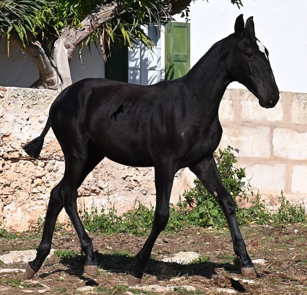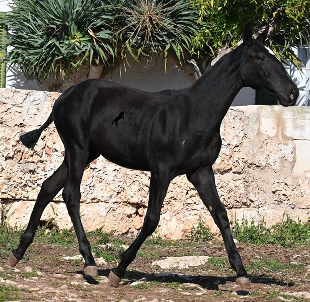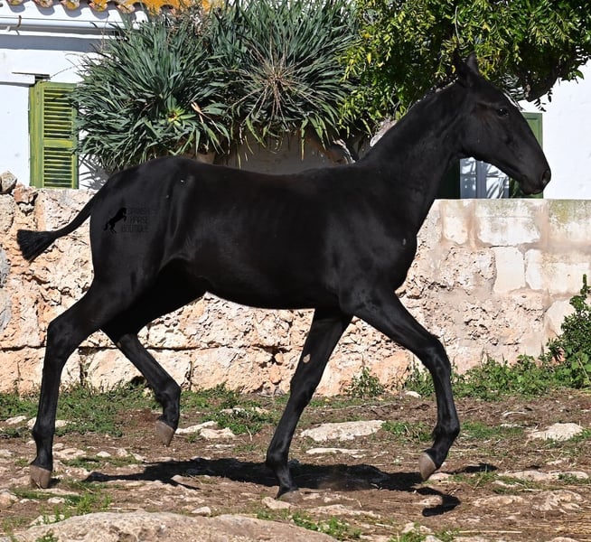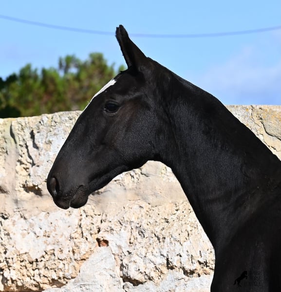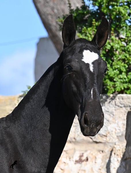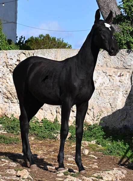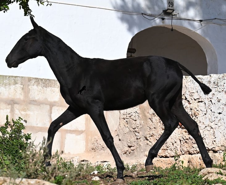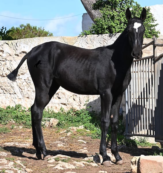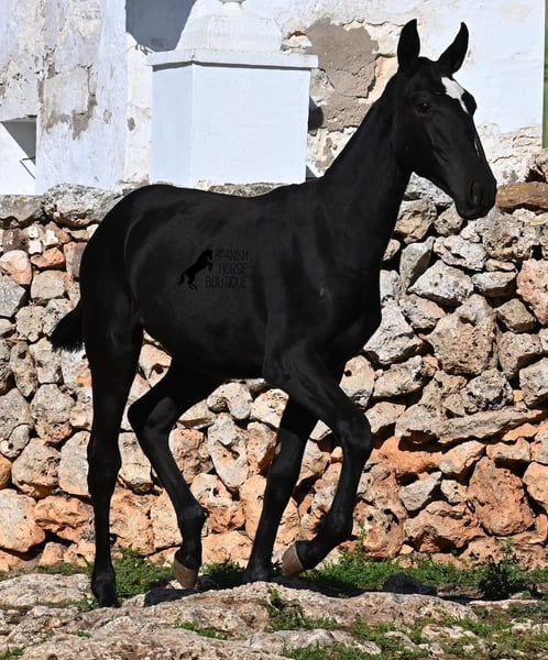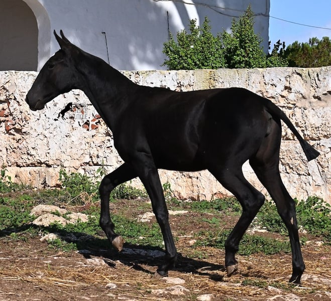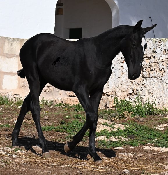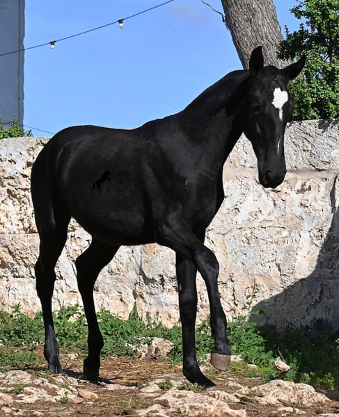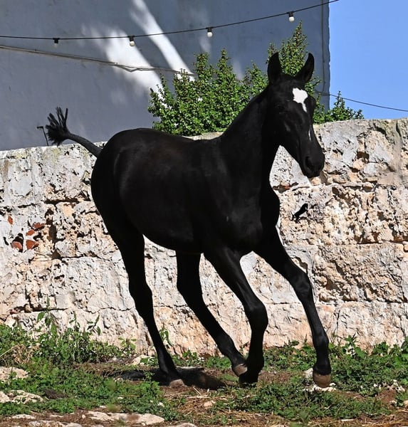 This purebred Menorquin mare, born in Spring 2025, undoubtedly stands out from the crowd thanks to her distinctive appearance! Her head markings are unique, and she boasts an ideal conformation for the breed. As is customary for a Menorquin, she is raised on rocky terrain and under a rugged climate. She is not only very sure-footed but already demonstrates her beautiful gaits on challenging ground. It’s easy to imagine how she will impress everyone with her movement in the dressage arena later on! Her pedigree is also impressive, as she is a daughter of one of only three elite stallions of the breed (her sire is over 16.1 hh). On her dam’s side, she descends from traditional Menorquin lines, and her head profile will make breed enthusiasts’ hearts beat faster. Her expected final height will be around 16.1 hh, making her suitable for many disciplines. It’s also wonderful to see how she already stretches out and how strong her topline is, which will benefit her as a riding horse in the future. She lives on many hectares of land in a herd, alongside older mares, and is well socialized. Videos and pedigree details are available upon request. Her location is Menorca. I am happy to arrange a foal health check, transport, or even her journey if you wish to visit her in person. Please see my website or contact me for more details. Greetings from Spain