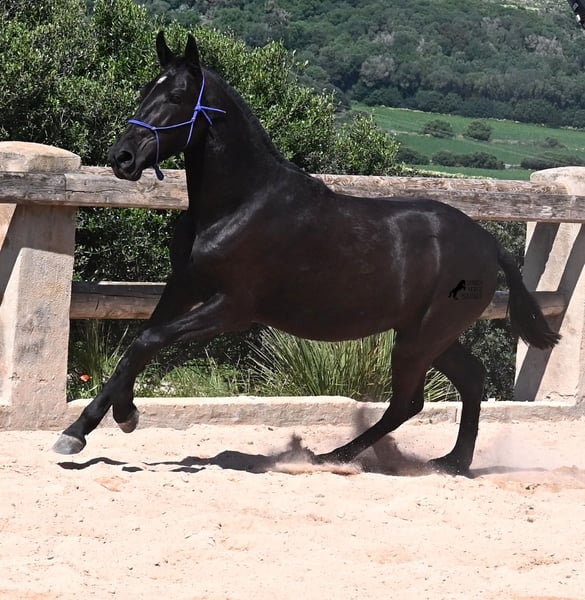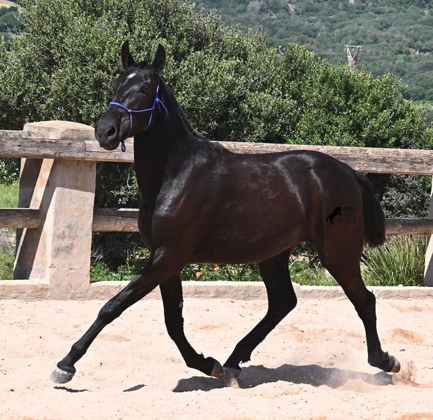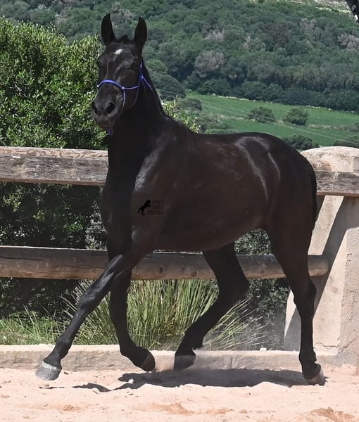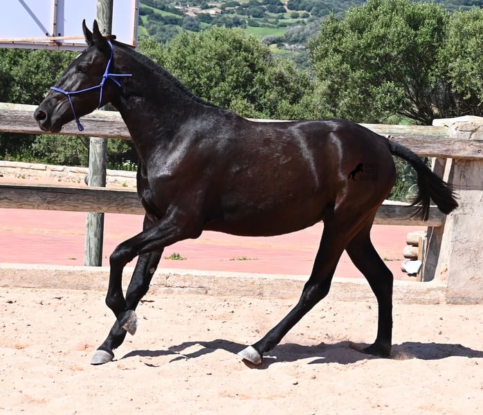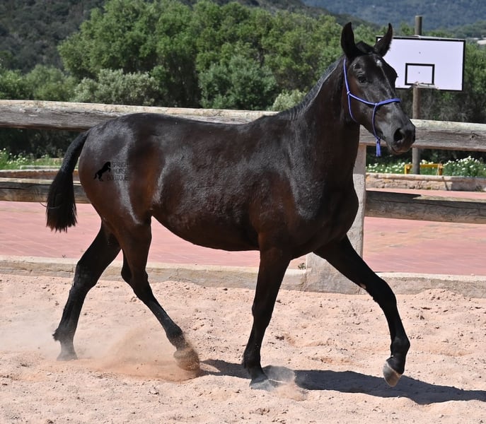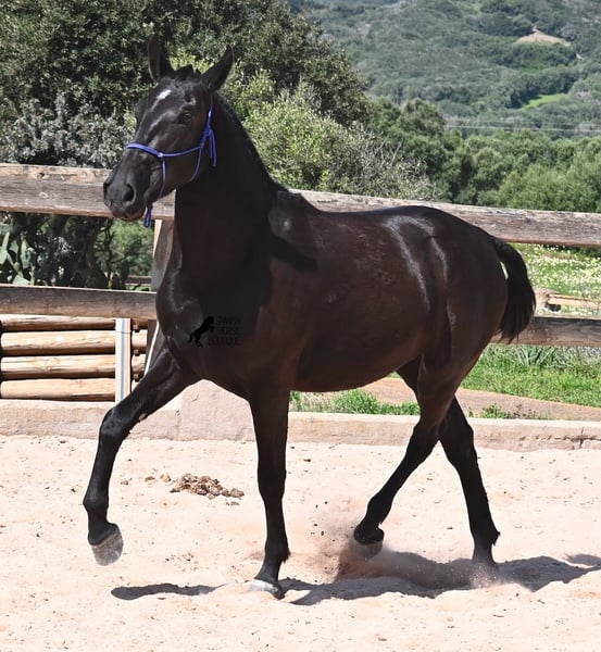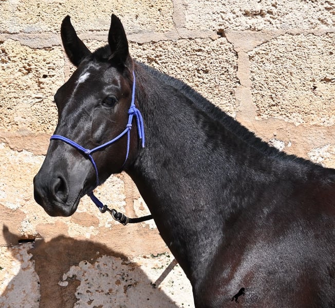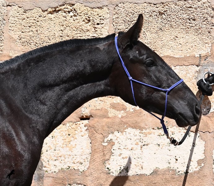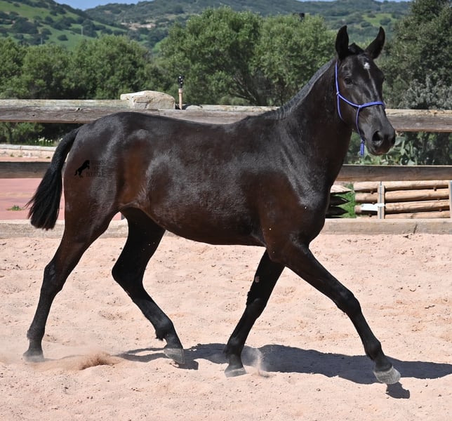 This purebred Menorquin mare, born in 2023, is already incredibly elegant for her tender age! She effortlessly demonstrates that mares are just as expressive as stallions ;) She proudly glides across the arena in an elegant trot, with strong propulsion from her hindquarters and a long suspension phase. Thanks to her compact conformation and agility, she will surely become interesting for Working Equitation later on! Of course, all disciplines are still open to her, and for now, she can develop from a young horse into a "proper horse." One doesn't need much imagination to envision how beautiful this mare will be when she is fully grown. Her father is an outstanding stallion, as 3 (!) of his offspring have become BREED CHAMPIONS, so this mare has very noble siblings. On her mother's side, we find the exceptional stallion ROSTOLL as her grandfather, and elite blood flows in her veins (there are only 3 elite stallions in the breed!). She lives in a herd in 24-hour robust housing, making her well-socialized and resilient, thanks to the harsh climate in Menorca. Currently standing at 153 cm, she is also compact and will likely remain under 160 cm while becoming even more baroque. She is currently located in Menorca! Videos and pedigree are available upon request. I would be happy to arrange a vet check, training, transportation, or even your visit to see her in person. Details are available on my page or in conversation. Greetings from Spain!