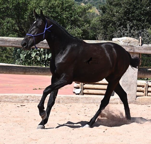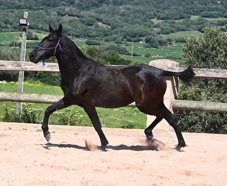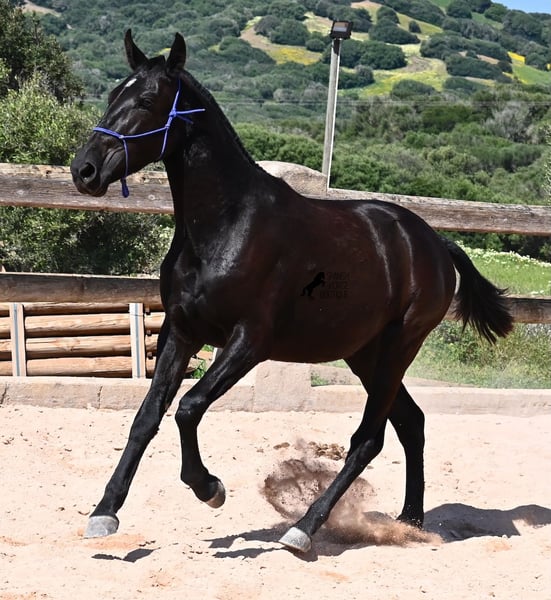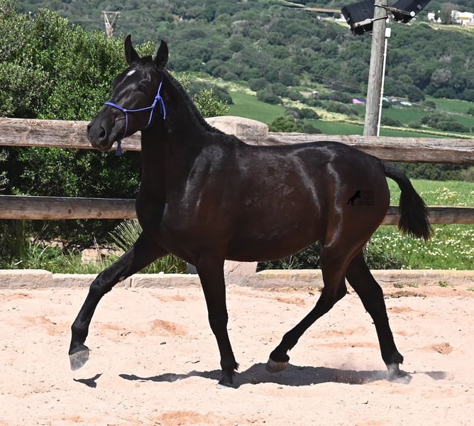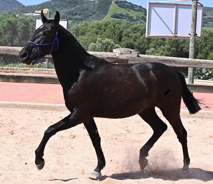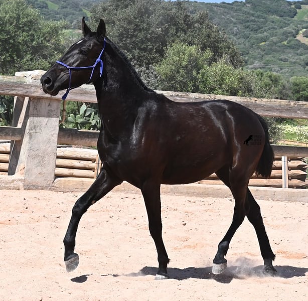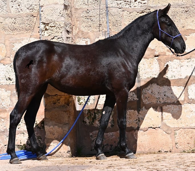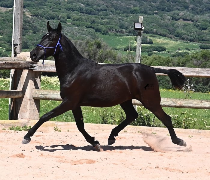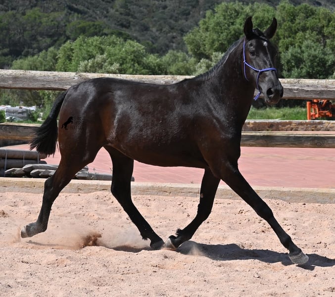 This purebred Menorquin mare, born in 2023, is already incredibly elegant for her tender age! She effortlessly demonstrates that mares are just as expressive as stallions ;) She proudly glides across the arena in an elegant trot, with strong propulsion from her hindquarters and a long suspension phase. Thanks to her compact conformation and agility, she will surely become interesting for Working Equitation later on! Of course, all disciplines are still open to her, and for now, she can develop from a young horse into a "proper horse." One doesn't need much imagination to envision how beautiful this mare will be when she is fully grown. Her father is an outstanding stallion, as 3 (!) of his offspring have become BREED CHAMPIONS, so this mare has very noble siblings. On her mother's side, we find the exceptional stallion ROSTOLL as her grandfather, and elite blood flows in her veins (there are only 3 elite stallions in the breed!). She lives in a herd in 24-hour robust housing, making her well-socialized and resilient, thanks to the harsh climate in Menorca. Currently standing at 153 cm, she is also compact and will likely remain under 160 cm while becoming even more baroque. She is currently located in Menorca! Videos and pedigree are available upon request. I would be happy to arrange a vet check, training, transportation, or even your visit to see her in person. Details are available on my page or in conversation. Greetings from Spain!