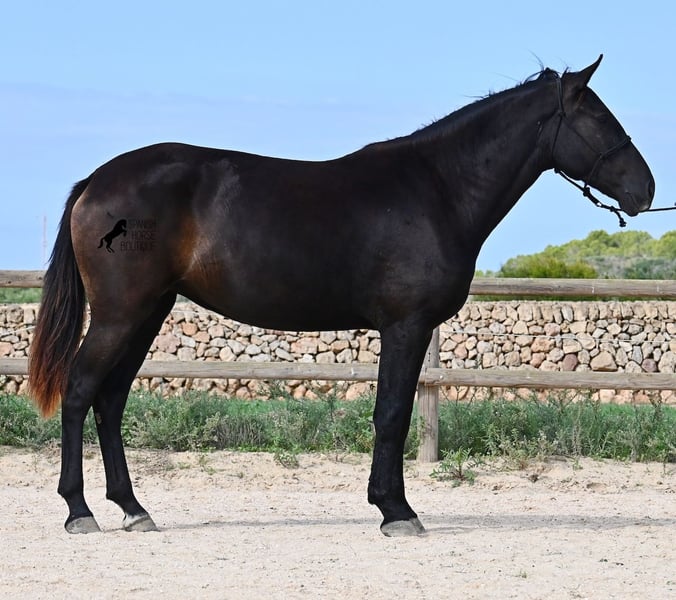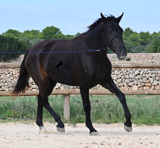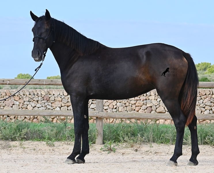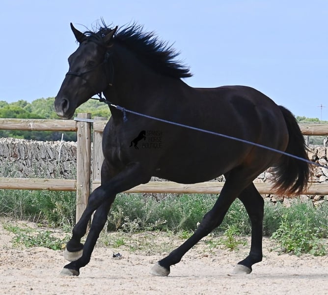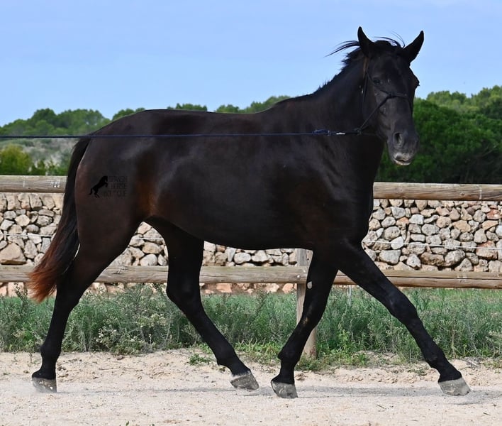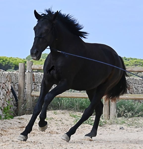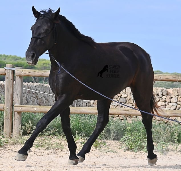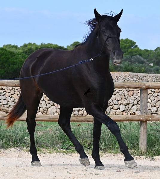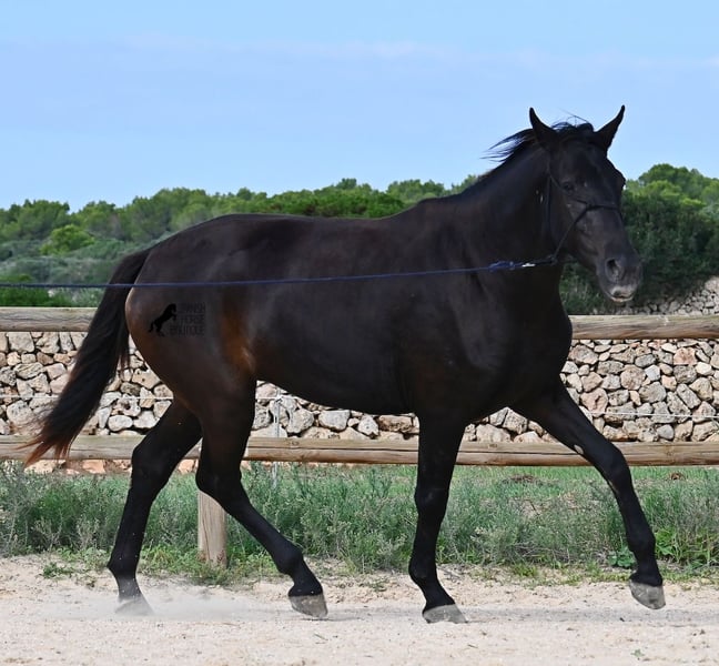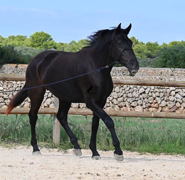 This loyal, gentle, and affectionate purebred Menorquin mare, born in 2023, already tells you a lot about her! She is a very sweet, calm, well-behaved, and refined young mare who wants to do everything right and is always attentive during work and handling. She lives in a herd and, thanks to the rugged climate and rocky terrain, she has strong hooves and clear legs. Speaking of legs, a close inspection reveals a barely visible white marking on one hind leg. Otherwise, she is completely black, as is desired in her breeding goal. She is already very well-behaved on the lunge line with a halter, although she is naturally still somewhat raw due to her age. Blood from very old lines of the Menorquin runs through her veins, known for endurance, bravery, and willingness to work, and she possesses all these qualities! She is compact and agile, which will make her interesting for many disciplines later on. Currently, she measures around 159 cm, and her final height will be just over 160 cm. Videos and pedigree available upon request. Her location is Menorca. I am happy to organize a foal health check, transport, or her journey if you wish to visit her in person. Details can be found on my website or in a personal conversation. Greetings from Spain