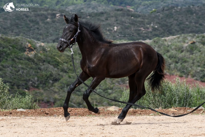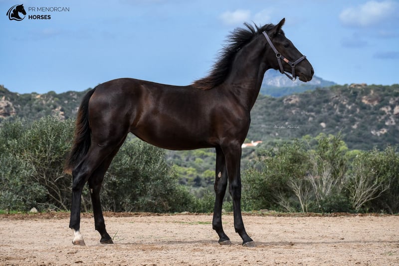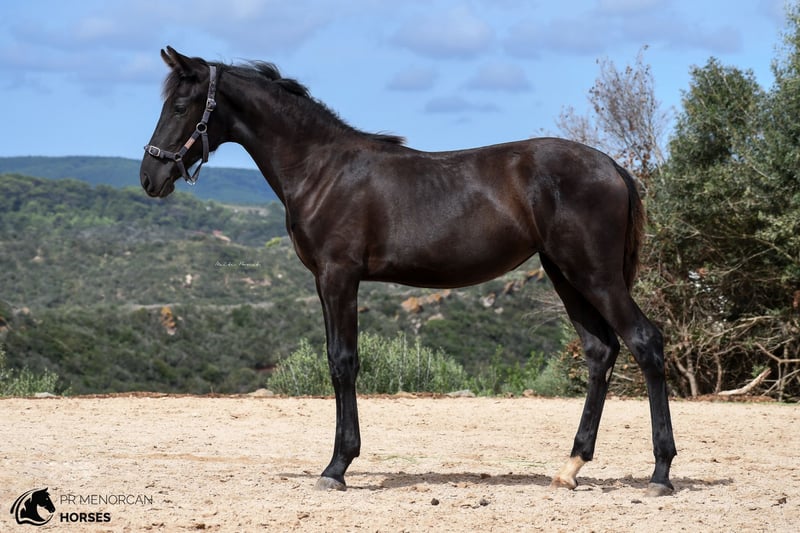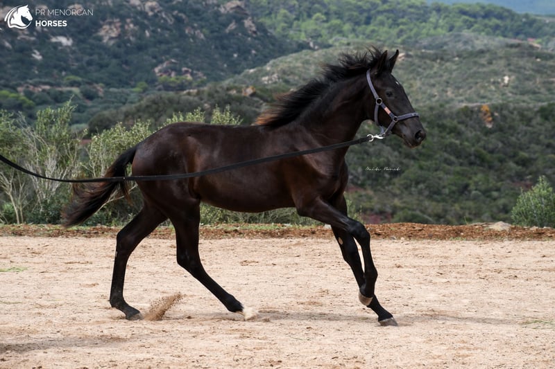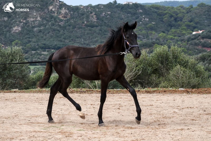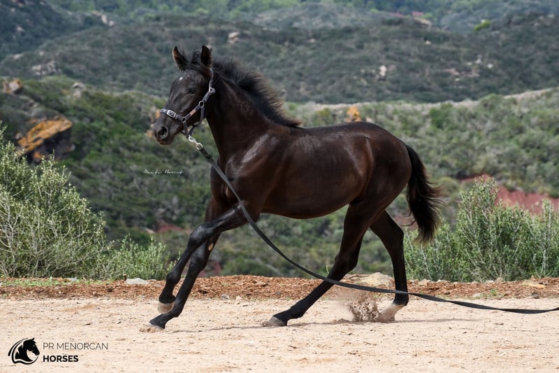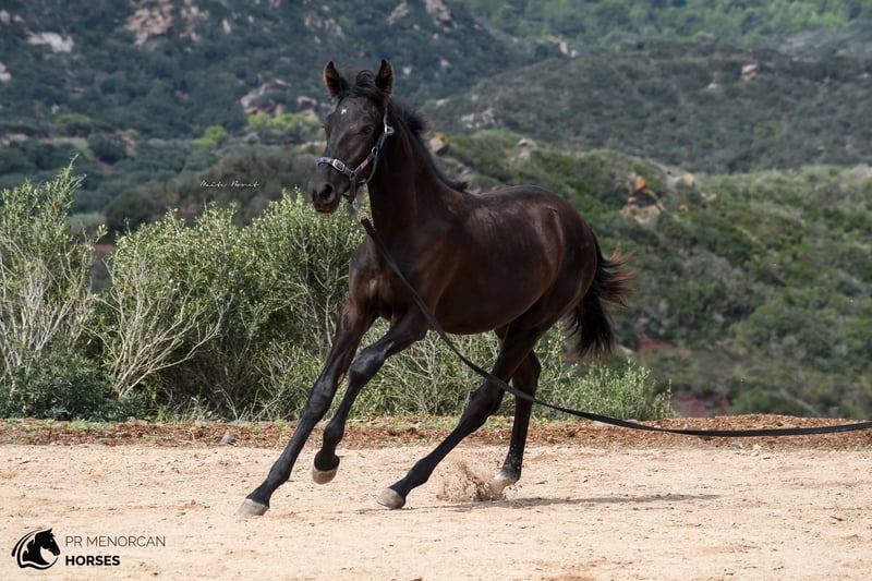 This super cute Pura Raza Menorquina filly, born in March 2023, is looking for a new home. She has a sporty physique like her father, an ELITE stallion with many awards for her good movements. Her mother is a very good mother, black and descended from older, more baroque lines. The filly has a white sock on her right foot and a small star on her forehead. Despite this, we think that she can be assessed as a breeding mare in the future, which would be very interesting due to her bloodlines. Both her father and mother are big, so we estimate that at least she should reach a height of 160cm or more. She is the sweetest thing, she lives free in the field with other fillies and mares, where she learns manners and at the same time grows strong and healthy. She approaches people even if she doesn't know them, she is curious and friendly. Despite her young age, she already allows herself to be guided with a halter and can even be longed! which demonstrates her predisposition to work and her intelligence. She could be left in Menorca and start her training here, or simply go to her new home, as everything is ready for her to travel. Regularly dewormed. You can come visit it yourself, or we can do the entire process online. I can also organize veterinary exams, paperwork and transportation worldwide. Located in Menorca For more info and videos send us a message ;) Cheers!