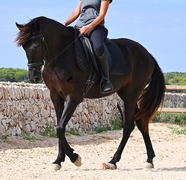 This 2022-born, purebred Menorquin mare has an invaluable character! She has been under saddle for a few months now and shines as a riding horse to such an extent that many fully trained horses can take her as an example. She doesn’t put a foot wrong, is incredibly attentive for a young horse, and remains so cool that nothing seems to faze her. She goes barefoot on trails, both alone and in a group, and even there she is absolutely well-behaved, which is not a given at her age. Her balance is truly remarkable for a young horse, and everything seems easy for her. Whether it’s maintaining contact or stretching nicely and marching along on a long rein, she handles it all with ease. Dogs of all sizes and the hustle and bustle of the farm with tractors and the like are part of her daily life, and she remains completely calm in those situations as well. Her pedigree combines a breed champion on her sire's side and very old lines of Menorquin on her dam's side, making her a versatile all-rounder! Her baroque and compact conformation also makes her interesting for Working Equitation. With her character, she is also a truly good family horse, as she is incredibly sweet to handle and ideal under saddle for learning together or going on leisurely rides. She lives in a herd environment, and thanks to the rough climate and rocky terrain, she has tough hooves and sound legs. She is also familiar with stalls and is always ready to travel to her new home :) The "sand lipstick" is, by the way, not permanent; she just decorated her muzzle individually for the photos ;) Currently, she measures around 161 cm, and her final height will be a few centimeters above that. The "sand lipstick" is, by the way, not permanent; she just decorated her muzzle individually for the photos ;) Videos and pedigree available upon request. Her location is Menorca. I am happy to organize a vet check for the foal on-site, transport, or her journey should you wish to come see her in person. Details can be found on my page or in conversation. Greetings from Spain!