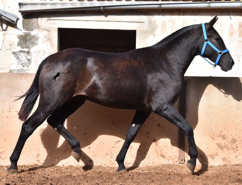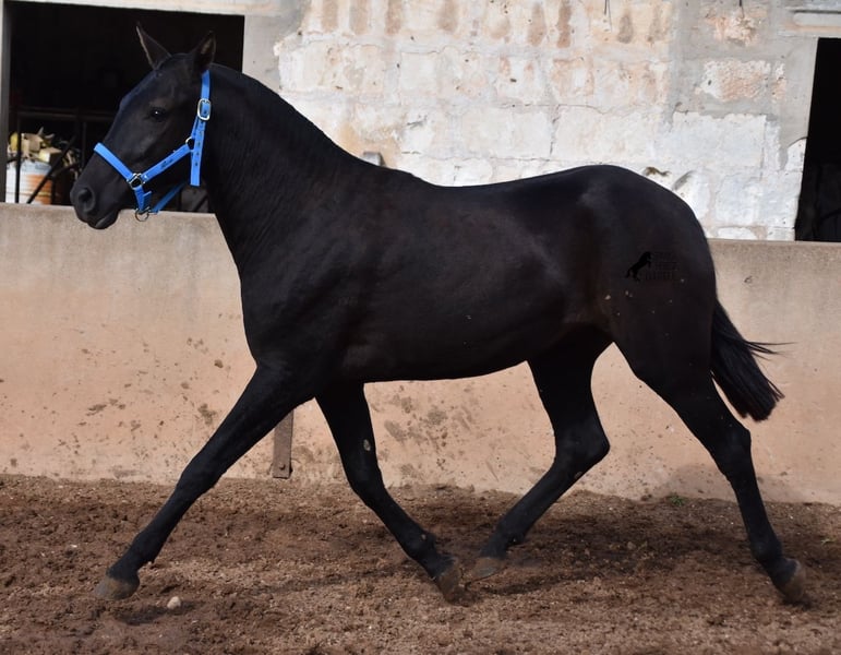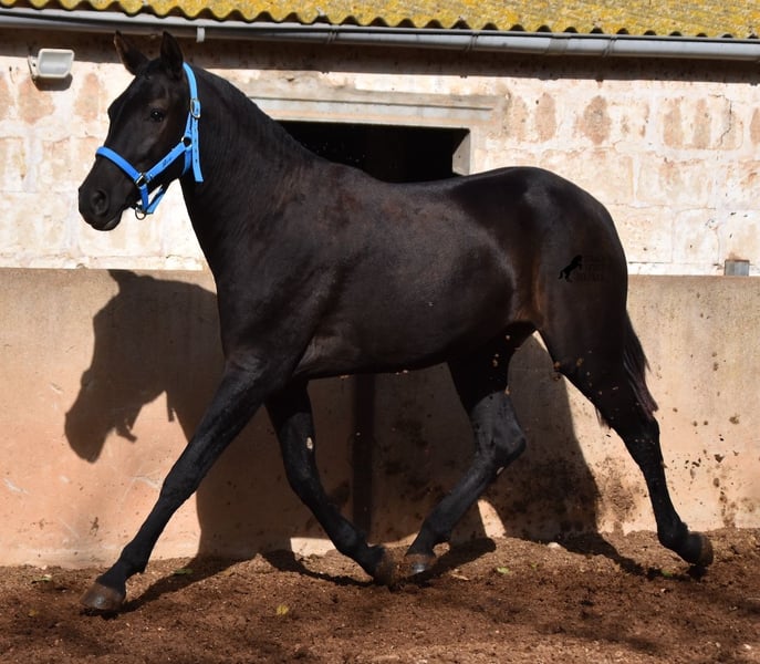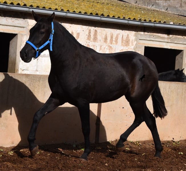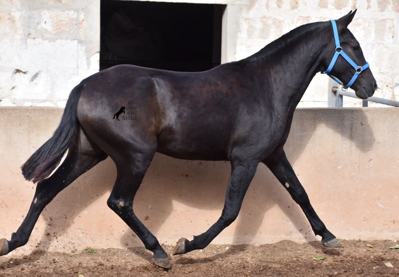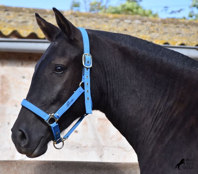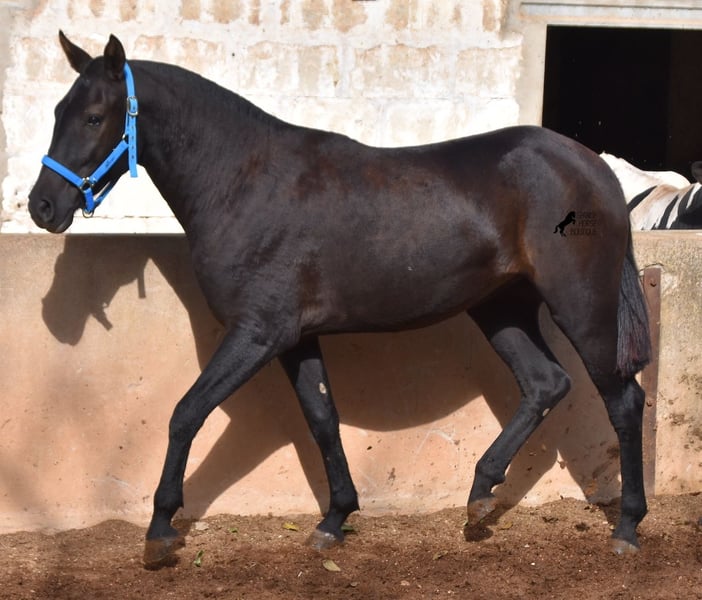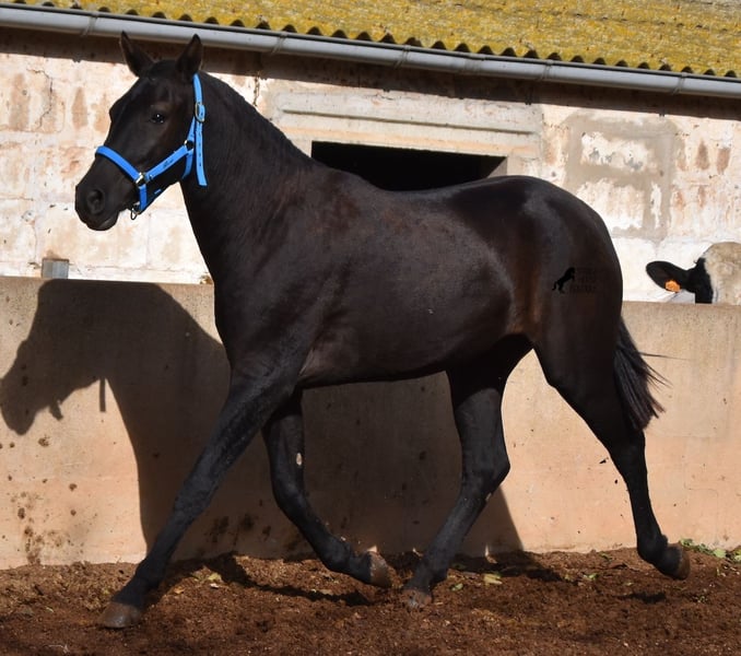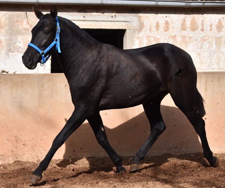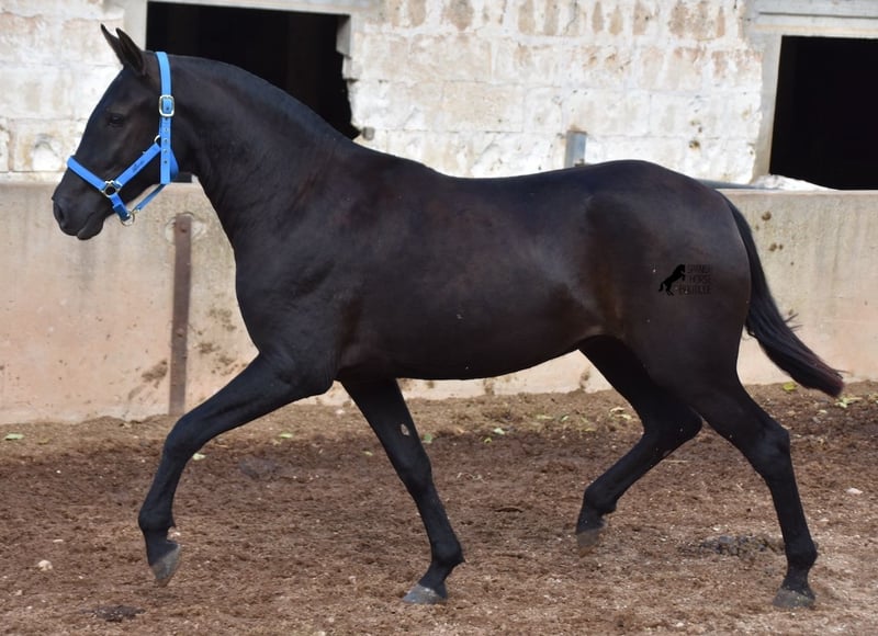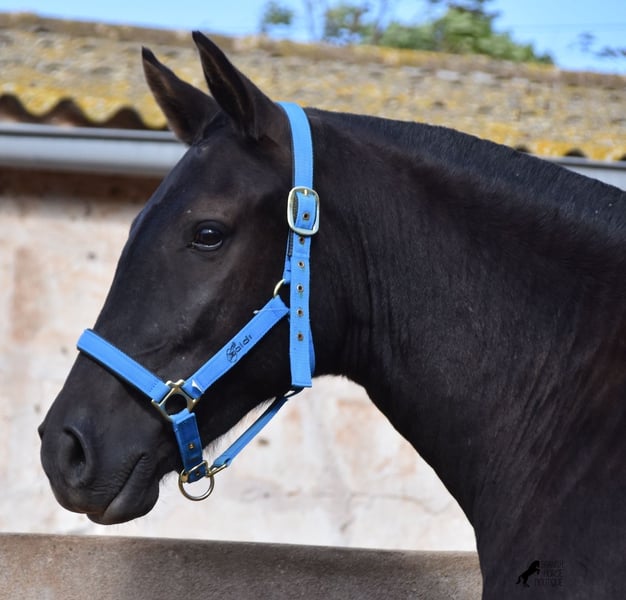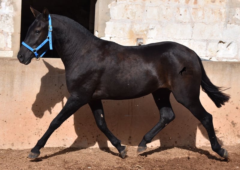 This delightful, purebred Menorquin mare from 2022 is already an incredibly chic lady! Her fine head, with a gentle but alert eye, just makes you melt away. She is completely black (without white markings) and has very elegant movements. She would certainly be great for working equitation later on! She is allowed to grow up in the true Menorcan way - on many hectares of land, she can live in a herd with mares of different ages and simply be a horse. Thanks to the hard, stony ground, she has great hoof quality and clear legs. The harsh climate of Menorca makes her a robust lady and she is well socialized as she is also in a herd with older mares. She is very curious and open-minded, knows her halter and knows how to be tied and showered. Standing up straight was still a little difficult, but otherwise she mastered the shoot with flying colors :) Her expected final height is approx. 159cm. There is a possibility that she will stay on a breeding place on Menorca if you want to let her grow up a bit more typical. Videos and pedigree available on request. Her location is Menorca. I would be happy to organize an AKU, transport or your trip if you come to see her in person. Details can be found on my website or in conversation. Saludos from Spain