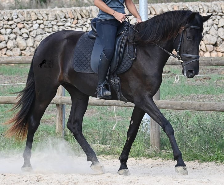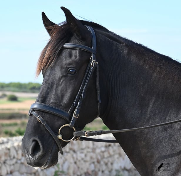 Questa puledra pura sangue, nata nel 2022, ha un carattere inestimabile! Da pochi mesi sotto la sella, si distingue come un cavallo da dressage così brillante che molti cavalli già addestrati possono prendere esempio da lei. Non fa un passo falso, è incredibilmente attenta per una giovanissima e così tranquilla da non lasciarsi disturbare. Va a piedi nudi in passeggiata, sia da sola che in gruppo, e anche in questo caso si comporta in modo assolutamente esemplare, cosa non scontata alla sua età. La sua equilibrio è davvero notevole per un puledro e tutto le sembra facile, sia mantenere il contatto che allungarsi elegantemente e marciare educatamente al passo lungo la redini. Abituata a incontrare cani di tutte le taglie e a vivere nel contesto di scuderia con trattori e altri mezzi, si dimostra molto cool anche in queste situazioni. La sua genealogia combina da parte del padre un campione di razza e da parte della madre linee molto antiche del Menorquín, rendendola una vera versatile! Il suo aspetto barocco e compatto la rende interessante anche per l’Equitazione di Lavoro. Con il suo carattere, è anche una cavalla molto adatta alla famiglia, perché sia nel rapporto quotidiano che sotto la sella è adorabile, perfetta per imparare insieme o per fare tranquille uscite a cavallo. Vive in branco e, grazie al clima rigido e ai terreni rocciosi, ha zoccoli duri e gambe robuste. Conosce anche il box e può partire in qualsiasi momento verso una nuova casa :) Il suo "rossetto di sabbia" non è permanente, si è semplicemente decorata la bocca per le foto. Attualmente misura circa 1,61 m e la sua altezza definitiva sarà qualche centimetro superiore. Per quanto riguarda i video e la genealogia, sono disponibili su richiesta. La sua sede è a Minorca. Posso organizzare sul posto un controllo veterinario di fattrice, un trasporto o anche il suo viaggio, se desiderate venire di persona a vederla. Per dettagli, contattatemi pure tramite il mio sito o in conversazione. Saluti dalla Spagna