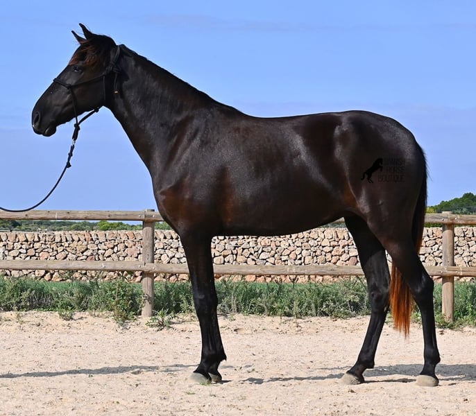 Née en 2022, cette jument pure race de Menorca possède un caractère inestimable ! Depuis quelques mois, elle est sous la selle et brille en tant que cheval de dressage au point que de nombreux chevaux parfaitement dressés peuvent prendre exemple sur elle. Elle ne fait pas un faux pas, fait preuve d’une attention incroyable pour un jeune cheval et est si calme qu’elle ne se laisse pas déstabiliser. Elle va pieds nus en extérieur, aussi bien seule qu’en groupe, et reste parfaitement sage, ce qui n’est pas évident à son âge. Son équilibre est vraiment remarquable pour un jeune cheval, et tout lui semble facile : maintenir le contact, s’étirer élégamment ou marcher calmement aux longues rênes. Les chiens de toutes tailles, ainsi que l’activité de la ferme avec tracteurs et autres machines, font partie de son quotidien, et elle reste totalement détendue face à tout cela. Son pedigree associe, du côté du père, un champion de race, et, du côté de la mère, des lignées très anciennes de Menorca, ce qui en fait une jument polyvalente ! Son physique baroque et compact la rend également intéressante pour la Working Equitation. Son caractère en fait aussi une excellente monture pour la famille, car elle est adorable en main et idéale sous la selle pour apprendre ou simplement faire de belles balades. Elle vit en troupeau et, grâce au climat rude et aux sols rocheux, elle a des sabots solides et des jambes nettes. Elle connaît également la boxe et est prête à voyager à tout moment vers sa nouvelle famille :) Le « lipstick de sable » n’est pas permanent, elle a simplement décoré sa bouche pour la séance photo ;) Elle mesure actuellement environ 1,61 m et sa taille finale dépassera quelques centimètres. Le « lipstick de sable » n’est pas permanent, elle a simplement décoré sa bouche pour la séance photo ;) Vidéo et pedigree sur demande. Elle se trouve à Minorque. Je peux organiser une échographie, un transport ou même son voyage si vous souhaitez venir la voir en personne. Plus de détails disponibles sur mon site ou lors d’un échange. Cordialement depuis l’Espagne