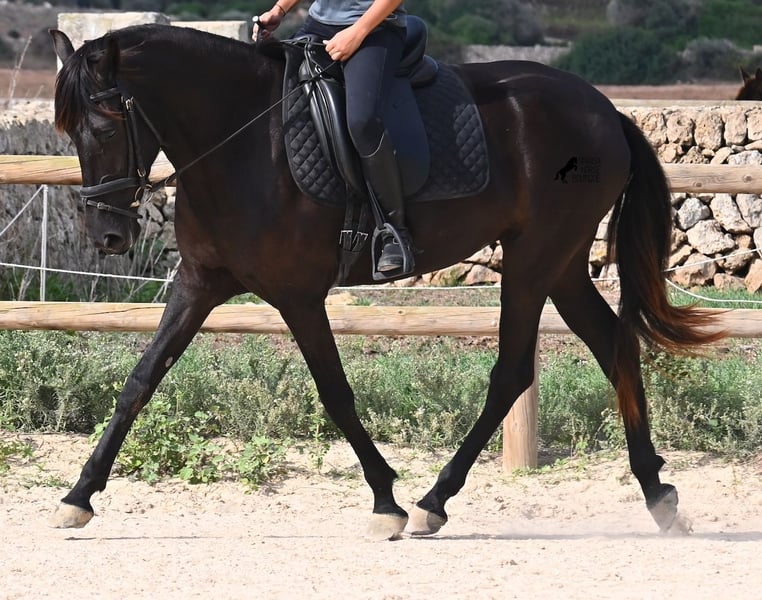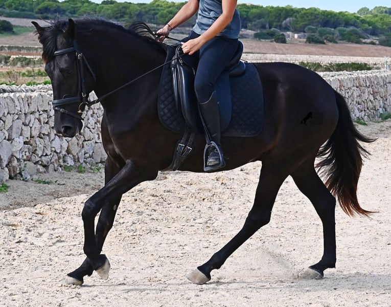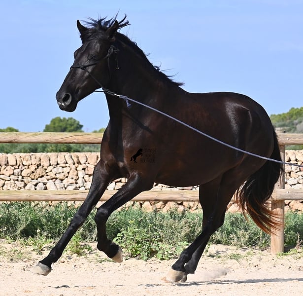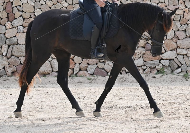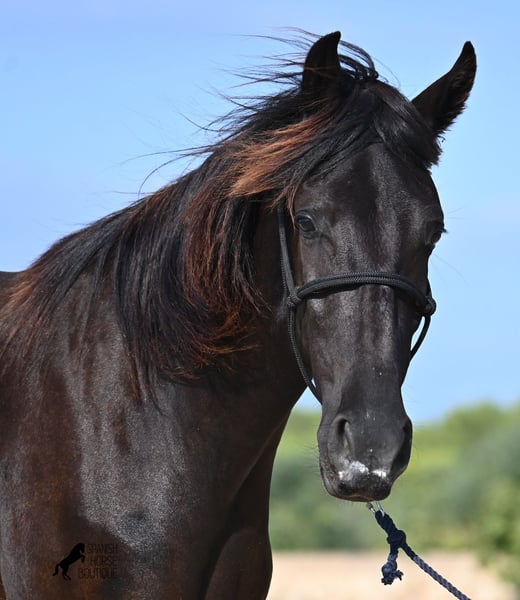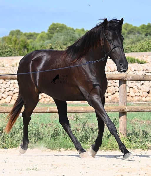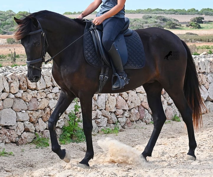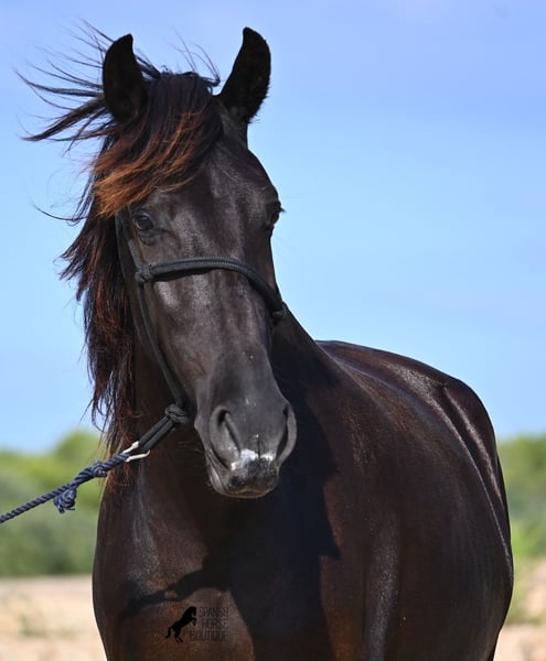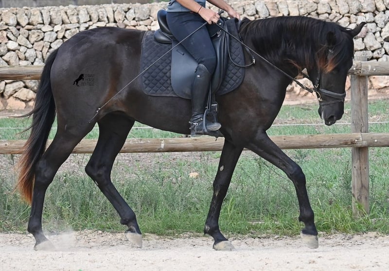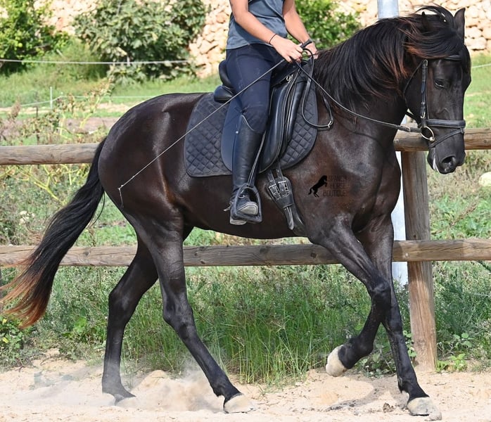 This 2022-born, purebred Menorquin mare has an invaluable character! She has been under saddle for a few months now and shines as a riding horse to such an extent that many fully trained horses can take her as an example. She doesn’t put a foot wrong, is incredibly attentive for a young horse, and remains so cool that nothing seems to faze her. She goes barefoot on trails, both alone and in a group, and even there she is absolutely well-behaved, which is not a given at her age. Her balance is truly remarkable for a young horse, and everything seems easy for her. Whether it’s maintaining contact or stretching nicely and marching along on a long rein, she handles it all with ease. Dogs of all sizes and the hustle and bustle of the farm with tractors and the like are part of her daily life, and she remains completely calm in those situations as well. Her pedigree combines a breed champion on her sire's side and very old lines of Menorquin on her dam's side, making her a versatile all-rounder! Her baroque and compact conformation also makes her interesting for Working Equitation. With her character, she is also a truly good family horse, as she is incredibly sweet to handle and ideal under saddle for learning together or going on leisurely rides. She lives in a herd environment, and thanks to the rough climate and rocky terrain, she has tough hooves and sound legs. She is also familiar with stalls and is always ready to travel to her new home :) The "sand lipstick" is, by the way, not permanent; she just decorated her muzzle individually for the photos ;) Currently, she measures around 161 cm, and her final height will be a few centimeters above that. The "sand lipstick" is, by the way, not permanent; she just decorated her muzzle individually for the photos ;) Videos and pedigree available upon request. Her location is Menorca. I am happy to organize a vet check for the foal on-site, transport, or her journey should you wish to come see her in person. Details can be found on my page or in conversation. Greetings from Spain!