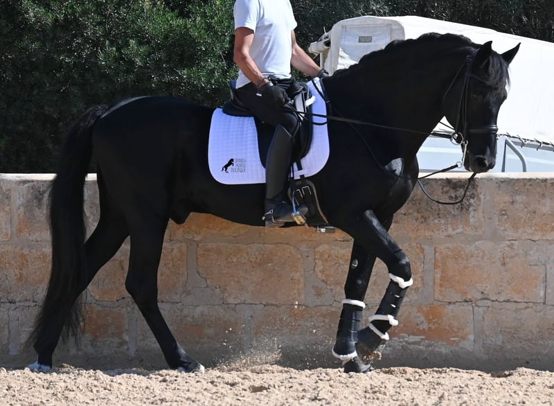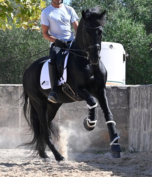 Este caballo de Pura Raza Menorquín, nacido en 2008, es un auténtico caballero en todos los sentidos. Su repertorio es tan amplio que parece capaz de aprender a leer y escribir ;) En la pista de doma, tiene experiencia en concursos y siempre se adapta de inmediato a su jinete. Cuando su propietario monta y quiere realizar movimientos de alto nivel, entra en modo de trabajo completo. Si lo monta su pequeño hijo, va muy despacio y con mucho cuidado, para no cometer ningún error. En el campo, disfruta de paseos y es completamente seguro, no solo bajo la silla, sino que, hace unos años, también se manejaba en carro con un tiro doble, por lo que seguramente recordaría esa experiencia rápidamente. Bajo la jinete, tiene mucho que ofrecer: trabajos laterales, pirueta en galop, cambios de mano, paso, paso español y todo esto tanto en cuatro riendas como en modo clásico. Cada paso está perfectamente controlado y, si no comprende algo con jineteos noveles, simplemente se ralentiza. Por ello, también es ideal para quienes desean aprender con un caballo que les pueda enseñar. Incluso en galop, se puede soltar las riendas y mantiene su ritmo en la pista de doma. Además, es muy cómodo para el jinete :) Aunque como semental inscrito ya tiene descendencia, también se adapta perfectamente a nuevos entornos y a caballos desconocidos, manteniéndose tranquilo y en calma. Esto seguramente se debe a su carácter, ya que vive como miembro de la familia en la finca del propietario, 24 horas al aire libre, con su hijo como compañero. Aunque conoce el box, se recomienda mantenerlo en paddock, ya que esto le ha mantenido en excelente forma, según ha demostrado. En el remolque, también es muy tranquilo y, incluso en un entorno nuevo (como en concursos), siempre está atento a su jinete. Para quienes no tengan posibilidad de mantener un semental, se puede castrar fácilmente en el lugar. Con 1,67 m de altura, tiene una estatura imponente y, por su aspecto barroco, parece aún más grande, aunque es muy dócil. Presenta marcas blancas discretas en las patas traseras. Precio acorde a su calidad. Actualmente, se encuentra en Menorca. Videos y genealogía disponibles bajo petición. Con gusto puedo organizar una revisión veterinaria, castración, entrenamiento, transporte o incluso su viaje, si desea venir a verlo en persona. Para más detalles, consulte mi página o hablemos. Saludos desde España