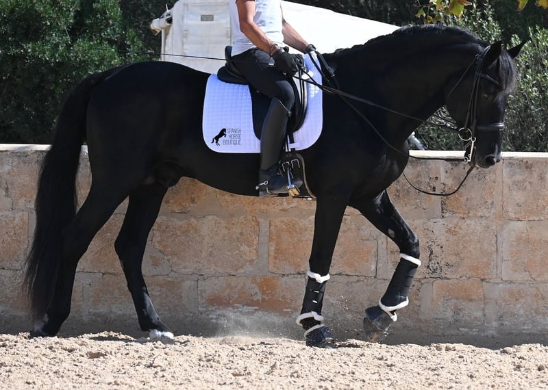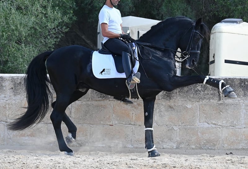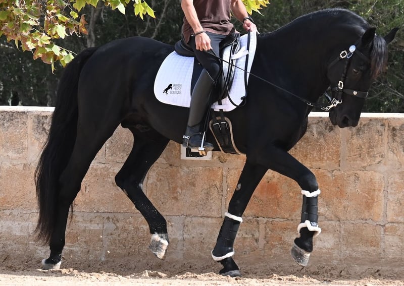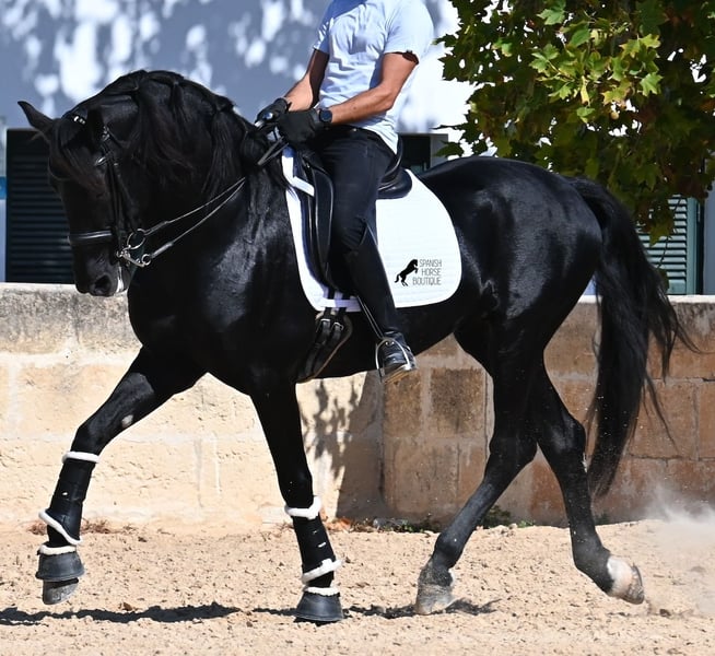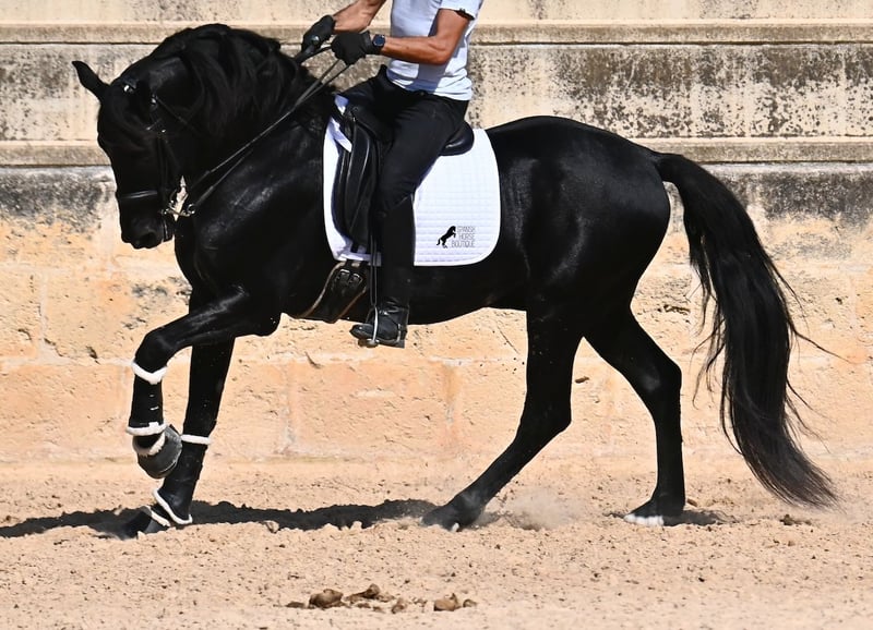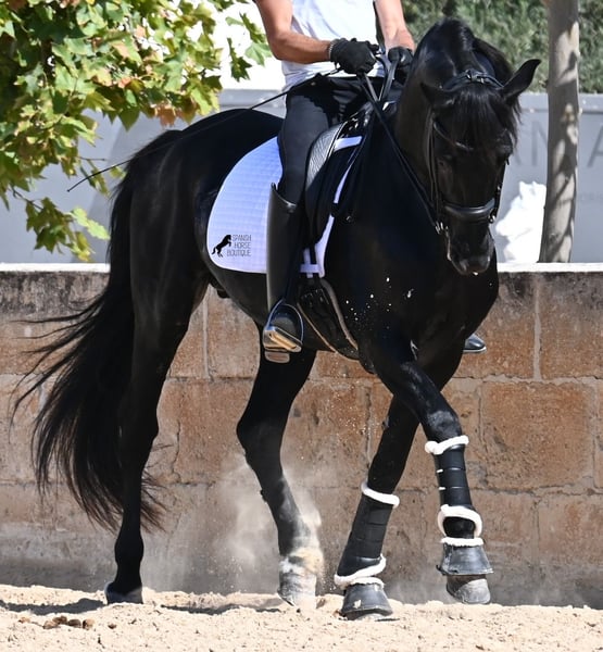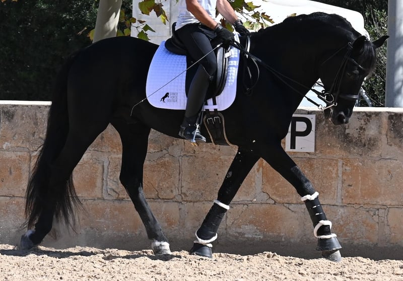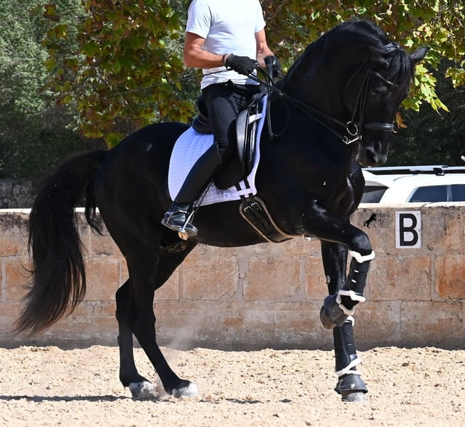 Deze in 2008 geboren, pure Menorquínhengst is een ware gentleman door en door. Zijn repertoire is zo breed dat je zou denken dat hij zelfs lezen en schrijven zou kunnen leren ;) In de dressuurbak heeft hij wedstrijdervaring en reageert hij altijd onmiddellijk op de ruiter. Als de eigenaar rijdt en graag hoge oefeningen wil doen, schakelt hij meteen in volle werkmodus. Rijdt de kleine zoon, dan gaat hij heel voorzichtig en rustig, om zeker geen verkeerde stap te zetten. In het buitengebied is hij graag onderweg en ook absoluut betrouwbaar, niet alleen onder het zadel, maar tot een paar jaar geleden reed hij ook aangespannen in de koets, wat hij zeker snel weer zou herinneren. Onder de ruiter heeft hij heel wat te bieden: laterale werken, galoppé, vliegende wissels, passage, Spaanse pas en dat zowel op vier handen als klassiek. Elke stap zit perfect, en als hij iets niet begrijpt bij nieuwe ruiters, wordt hij gewoon langzamer. Daardoor is hij ook ideaal voor iedereen die een paard wil dat nog van hen kan leren. Zelfs in galop kun je de teugels loslaten, en hij houdt zijn ritme op het rijterrein! En daarbij is hij echt zitcomfortabel :) Hoewel hij als gekeurde hengst al nakomelingen heeft, blijft hij ook in een nieuwe omgeving, met onbekende paarden, absoluut kalm en in zichzelf. Dit komt zeker door zijn houding, want hij mag als familielid op de boerderij van de eigenaar leven, 24 uur buiten en met zijn zoon als gezelschap. Ook al kent hij de box, minimaal weidegang wordt door de eigenaar aanbevolen, omdat dat hem duidelijk zo fit houdt. Hij is ook braaf met inladen en blijft, zelfs in een nieuwe omgeving (bijvoorbeeld op een concours), altijd aandachtig bij zijn mens. Voor degenen die geen hengstenhouderijmogelijkheden hebben, kan hij ter plaatse gecastreerd worden. Met 1,67 m heeft hij een mooie grote bouw en door zijn barokke uitstraling lijkt hij zelfs nog groter, maar hij is zeer zachtaardig. Hij heeft subtiele witte aftekeningen op de achterbenen. Prijs volgens de kwaliteit. Momenteel staat hij op Menorca! Video’s en afstamming op aanvraag. Graag organiseer ik ter plaatse een AKU, castratie, training, transport of zelfs uw reis, mocht u persoonlijk komen kijken. Details hierover graag via mijn website of in gesprek. Groeten uit Spanje