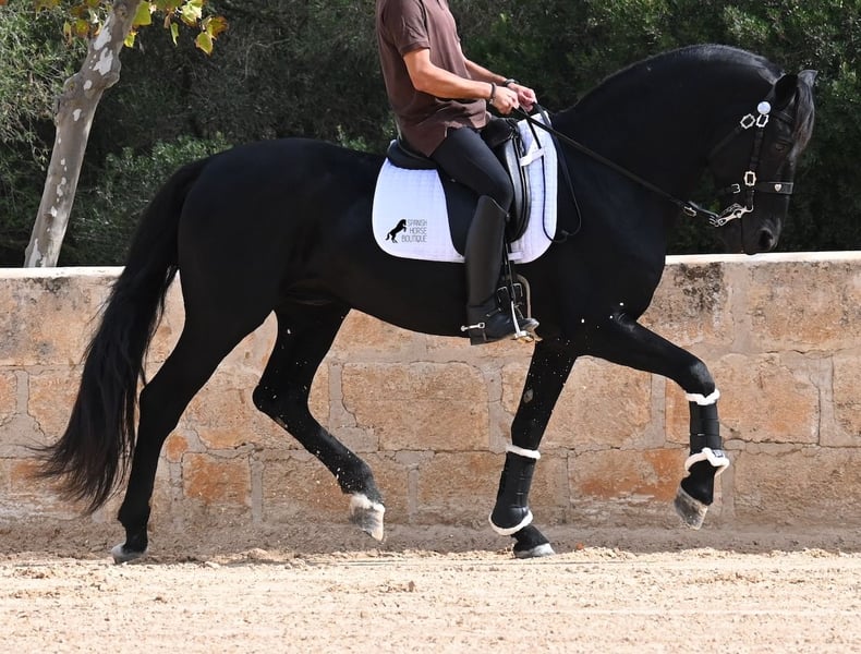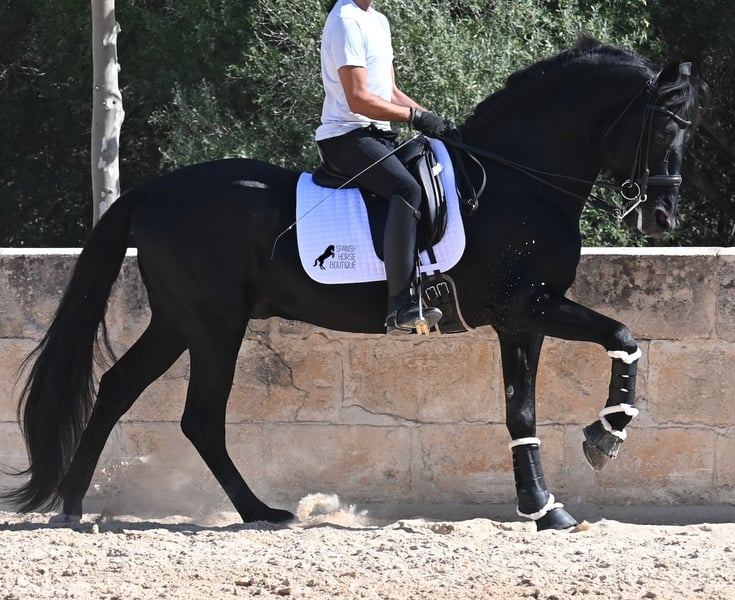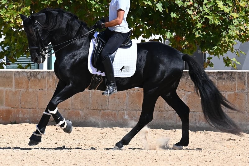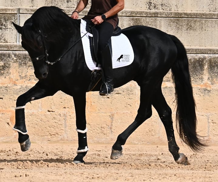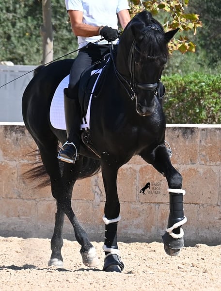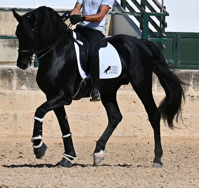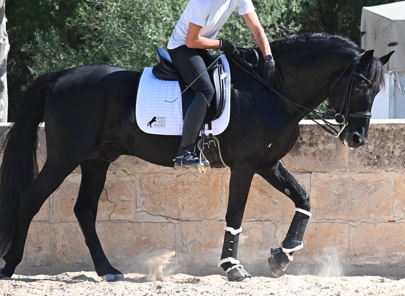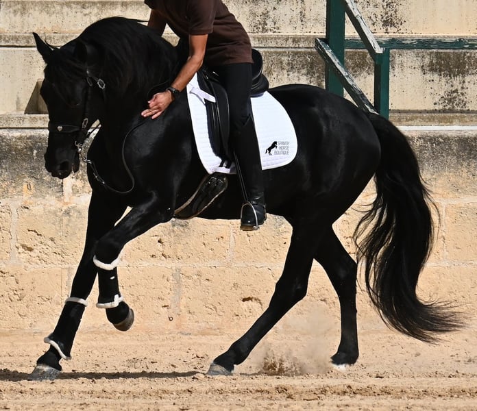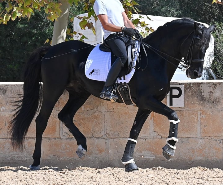 Deze in 2008 geboren, pure Menorquínhengst is een ware gentleman door en door. Zijn repertoire is zo breed dat je zou denken dat hij zelfs lezen en schrijven zou kunnen leren ;) In de dressuurbak heeft hij wedstrijdervaring en reageert hij altijd onmiddellijk op de ruiter. Als de eigenaar rijdt en graag hoge oefeningen wil doen, schakelt hij meteen in volle werkmodus. Rijdt de kleine zoon, dan gaat hij heel voorzichtig en rustig, om zeker geen verkeerde stap te zetten. In het buitengebied is hij graag onderweg en ook absoluut betrouwbaar, niet alleen onder het zadel, maar tot een paar jaar geleden reed hij ook aangespannen in de koets, wat hij zeker snel weer zou herinneren. Onder de ruiter heeft hij heel wat te bieden: laterale werken, galoppé, vliegende wissels, passage, Spaanse pas en dat zowel op vier handen als klassiek. Elke stap zit perfect, en als hij iets niet begrijpt bij nieuwe ruiters, wordt hij gewoon langzamer. Daardoor is hij ook ideaal voor iedereen die een paard wil dat nog van hen kan leren. Zelfs in galop kun je de teugels loslaten, en hij houdt zijn ritme op het rijterrein! En daarbij is hij echt zitcomfortabel :) Hoewel hij als gekeurde hengst al nakomelingen heeft, blijft hij ook in een nieuwe omgeving, met onbekende paarden, absoluut kalm en in zichzelf. Dit komt zeker door zijn houding, want hij mag als familielid op de boerderij van de eigenaar leven, 24 uur buiten en met zijn zoon als gezelschap. Ook al kent hij de box, minimaal weidegang wordt door de eigenaar aanbevolen, omdat dat hem duidelijk zo fit houdt. Hij is ook braaf met inladen en blijft, zelfs in een nieuwe omgeving (bijvoorbeeld op een concours), altijd aandachtig bij zijn mens. Voor degenen die geen hengstenhouderijmogelijkheden hebben, kan hij ter plaatse gecastreerd worden. Met 1,67 m heeft hij een mooie grote bouw en door zijn barokke uitstraling lijkt hij zelfs nog groter, maar hij is zeer zachtaardig. Hij heeft subtiele witte aftekeningen op de achterbenen. Prijs volgens de kwaliteit. Momenteel staat hij op Menorca! Video’s en afstamming op aanvraag. Graag organiseer ik ter plaatse een AKU, castratie, training, transport of zelfs uw reis, mocht u persoonlijk komen kijken. Details hierover graag via mijn website of in gesprek. Groeten uit Spanje
