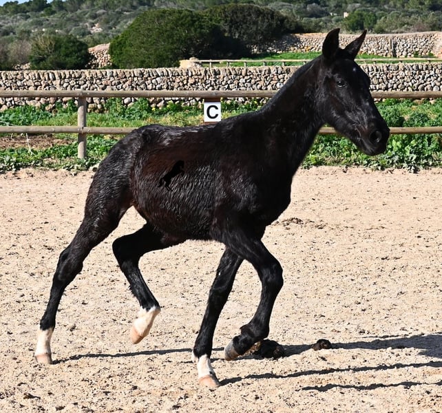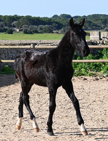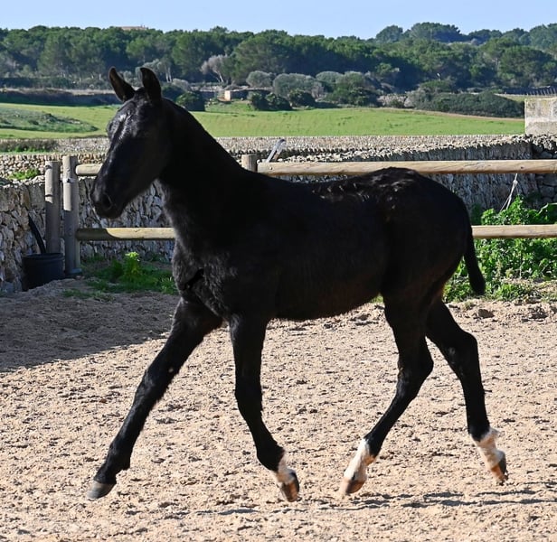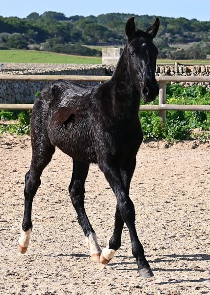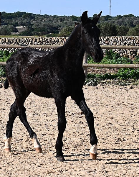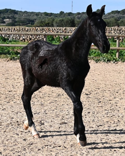 Este potro de raza pura, nacido en la primavera de 2025, tiene una apariencia muy especial. Con tres calcetas blancas y una pequeña estrella, destaca de inmediato en el grupo, y su patrón de manchas es hoy en día una rareza. Proviene de líneas antiguas muy puras del Menorquín, que cada vez se pierden más, y es admirable que algunos criadores intenten preservarlas. Sin embargo, en el pasado, había aún más ejemplares con marcas blancas en la raza, y esto claramente se refleja en él ;) Según las regulaciones actuales de selección, no podrá ser aprobado como semental debido a su cantidad de blanco, pero será un caballo de doma o de tiro maravilloso. Tiene movimientos elegantes, es muy flexible y ágil, lo que seguramente también lo hará interesante para la Working Equitation en el futuro. Como corresponde a un potro joven, su rutina diaria consiste en jugar en la manada, crecer y desarrollarse ;) En muchos hectáreas de tierra, está al aire libre las 24 horas del día, con cualquier clima, por lo que es un caballo resistente, con patas firmes, mente clara y cuerpo fuerte. Es muy curioso, ha aprendido a salir de la caja y tiene un sólido ABC del potro, que puede consultarse en cualquier momento. Su tamaño final esperado es de aproximadamente 1,60 m. Para quienes deseen adquirirlo más adelante, existe la opción de reservarle un lugar en la finca para su crianza. Videos y genealogía disponibles bajo petición. Su ubicación actual es Menorca. Con gusto puedo organizar una revisión de salud de potros (AKU), transporte o incluso su viaje, si decides venir personalmente a verlo. Para más detalles, puedes consultar mi página o contactarme directamente. Saludos desde España