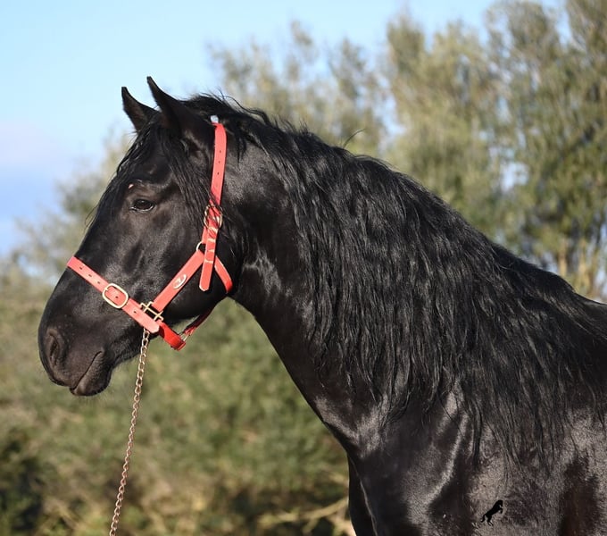 Este semental de Menorquina, nacido en 2021, es sin duda un hermoso representante de esta noble raza. De color negro brillante con una melena con ondas naturales y sin un solo cabello blanco, ¡una verdadera elegancia! Además, posee movimientos muy buenos, lo que lo hace interesante para la doma, especialmente si se desea entrenar en inglés, ya que actualmente está entrenado en la técnica de doma menorquina, que se monta en una mano. Sin embargo, la transición no le resultará difícil, ya que es muy inteligente y, habiendo sido trabajado en carro, conoce el manejo de las riendas. Es un caballo muy fino bajo el jinete, muy trabajador y con una presencia increíble. Como también es muy flexible y ligero de patas, es un candidato interesante para la Working Equitation. Su formación básica es muy sólida, domina los trabajos laterales y el paso español. También realiza el bot, el paso elevado, aunque solo lo hace a petición, ya que respeta claramente las órdenes. Ya mide unos imponentes 1,69 m y probablemente aumentará un poco en su exterior barroco, ya que los menorcinos son de desarrollo tardío y no alcanzan su plena madurez hasta los 8 años. De excelente linaje, proviene de un padre de líneas clásicas muy bueno y de una madre premiada con sangre de élite, que ya ha transmitido y dado a luz una hermosa cría de semental. En mano está bien criado, aunque algo juguetón, ya que actualmente no se trabaja mucho con él por falta de tiempo de su dueño, lo cual también es la razón de su venta. Tras unos minutos de paseo, se muestra muy relajado e incluso puede quedarse quieto junto a la pista de doma durante minutos, mientras conversas. Bajo un manejo adecuado, este caballo tiene mucho potencial, y también es un verdadero tesoro para el ocio, especialmente si recibe más actividad (o en un paddock o establo abierto). También sale a pasear, generalmente en pareja o en grupo. Cuando hay yeguas, bailotea un poco para mostrar lo hermoso que es, pero pronto se da cuenta de que es una pérdida de tiempo y se relaja. Para quienes no puedan mantenerlo como semental, existe la opción de castración en el lugar. Su ubicación actual es Mallorca. Videos y genealogía disponibles bajo petición. Con gusto puedo organizar una evaluación veterinaria, entrenamiento, castración, transporte o incluso su viaje, si desea venir a verlo en persona. Para más detalles, consulte mi página o hable conmigo. Saludos desde España