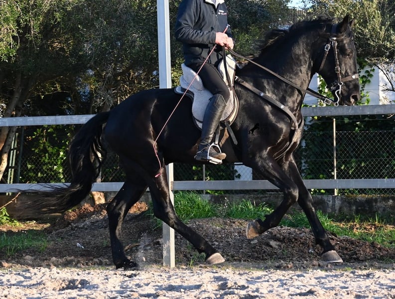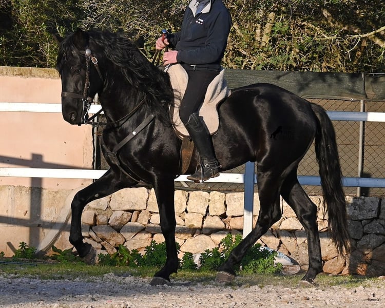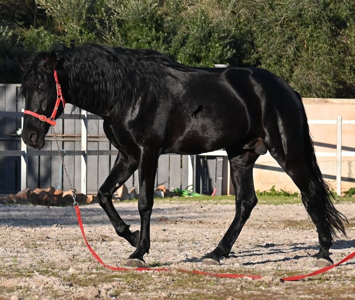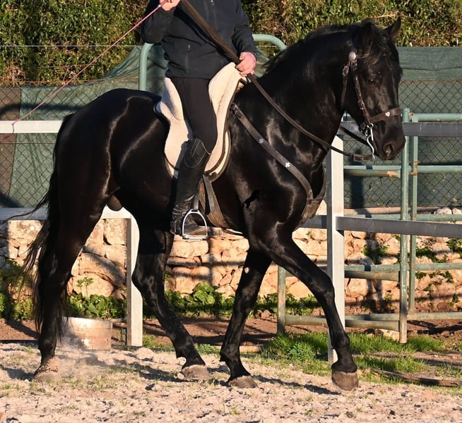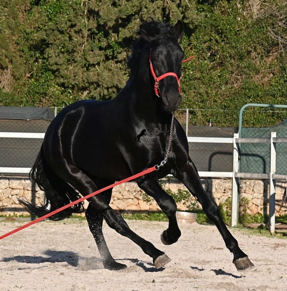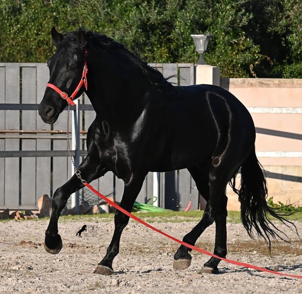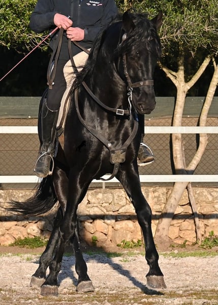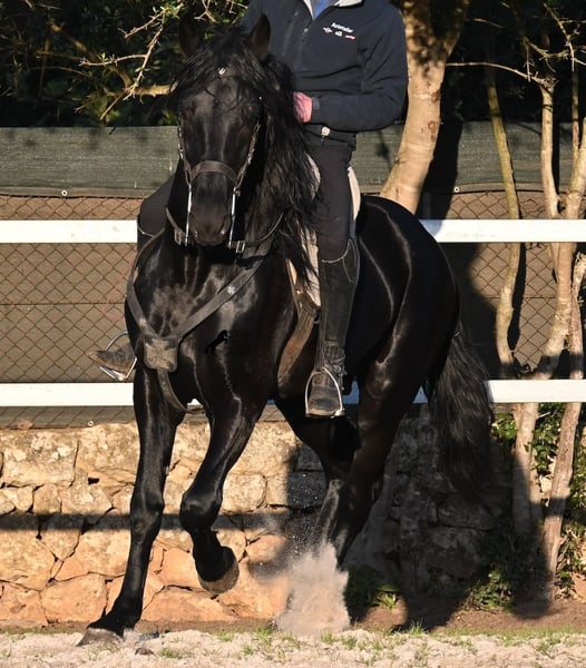 Dieser 2021 geborene, reinrassige Menorquinhengst, ist ohne Zweifel ein bildschöner Vertreter dieser edlen Rasse! Glänzend schwarz mit natürlicher Welle in der Mähne und nicht ein weißes Haar- Eleganz pur! Dazu hat er noch sehr gute Gänge, die ihn für die Dressur interessant machen, sollte man ihn auf englisch trainieren wollen, denn aktuell ist er in der menorquinischen Reitweise ausgebildet, die einhändig geritten wird. Die Umstellung wird ihm aber bestimmt nicht schwer fallen, denn er ist sehr intelligent und da er vor der Kutsche eingespannt wurde, kennt er die Zügelführung. Ein absolut feines Pferd unter dem Reiter, sehr arbeitssam und unglaublich wiff. Da er auch sehr biegsam und leichtfüßig ist, ist er auch in interessanter Kandidat für die Working Equitation. Seine Grundausbildung ist sehr solide mit lateralen Arbeiten und spanischen Schritt beherrscht er auch. Sowie den typischen Bot, das Steigen, wobei er es nur auf Abruf macht, weil er ganz klar die Kommandos respektiert. Er hat schon stattliche 169cm und wird noch an barockem Exterieur etwas zulegen, da die Menorquin Spätentwickler sind und noch nicht voll entwickelt bis 8 Jahre. Seine hervorragende Abstammung von einem sehr guten Vater klassischer Linien und einer prämierten Mutter mit Eliteblut, hat er schon weitergegeben und ein schönes Hengstfohlen hervorgebracht. An der Hand ist er erzogen aber etwas verspielt, denn er wird aktuell nicht so viel gearbeitet, aus Zeitmangel der Besitzer, was auch der Verkaufsgrund ist. Sobald er sich 5 Minuten die Beine vertreten hat, ist er tiefenentspannt und bleibt sogar frei am Reitplatz neben einem minutenlang stehen, wenn man sich unterhält. In fördernden Händen, hat dieses Pferd richtig viel Potenzial und auch für den Freizeitbereich ist er ein richtiger Schatz, wenn er etwas mehr Auslastung (oder Offenstall/Paddock) bekommt. Ausreiten geht er auch, meistens zu zweit oder in der Gruppe. Wenn Stuten dabei sind, tänzelt er kurz um zu zeigen, wie schön er wirklich ist, merkt aber gleich dass es verlorene Liebesmüh ist und geht in die Entspannung. Wer ihn als Hengst nicht halten kann, für den besteht selbstverständlich die Möglichkeit der Kastration vor Ort. Sein Standort ist Mallorca. Videos und Abstammung gerne auf Anfrage. Gerne organisiere ich vor Ort eine AKU, Beritt, Kastration, Transport oder auch ihre Reise, sollten Sie persönlich zum Anschauen kommen. Details dazu gerne auf meiner Seite oder im Gespräch. Saludos aus Spanien