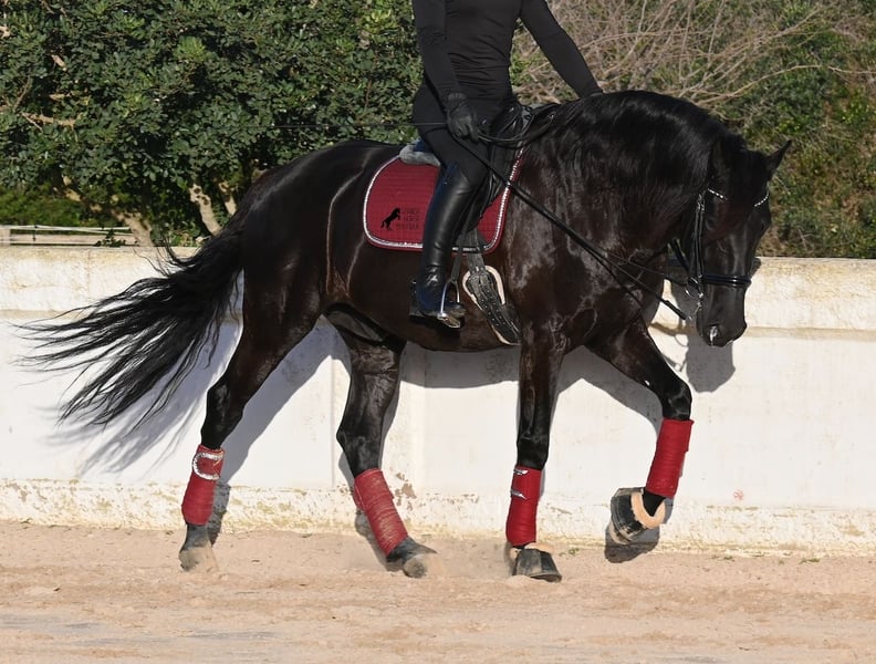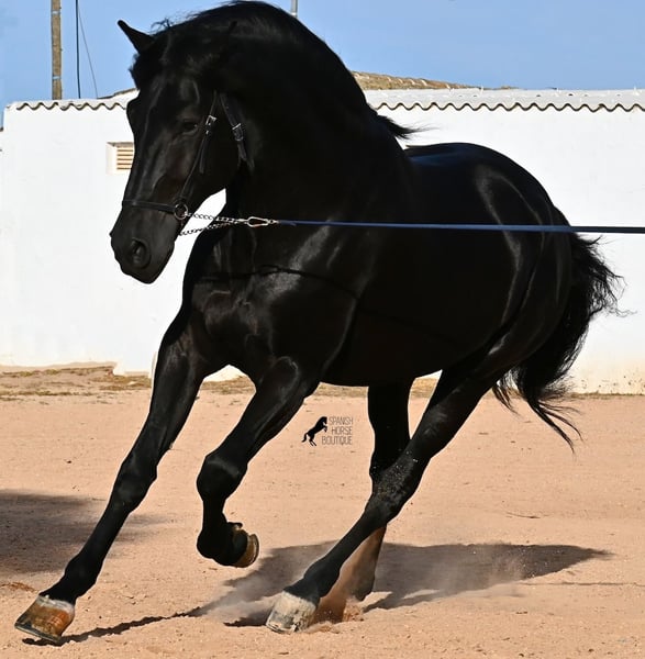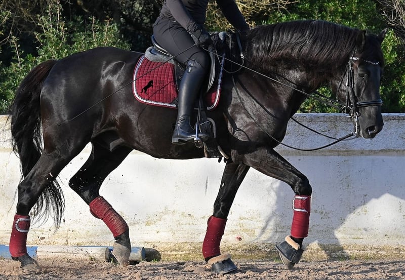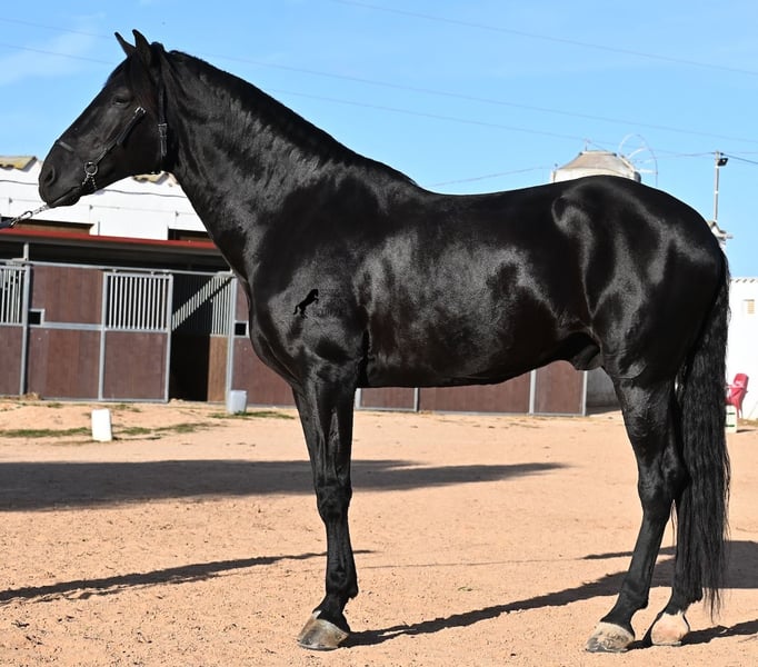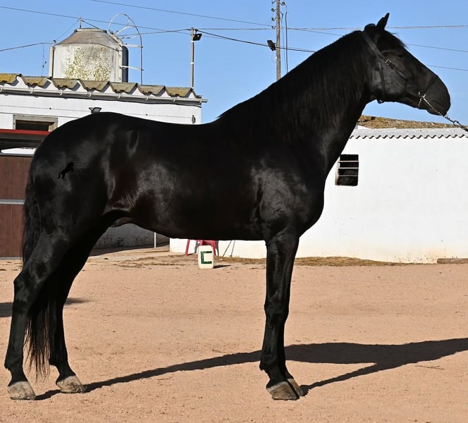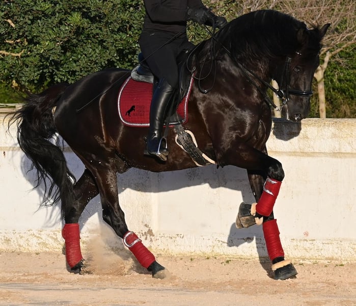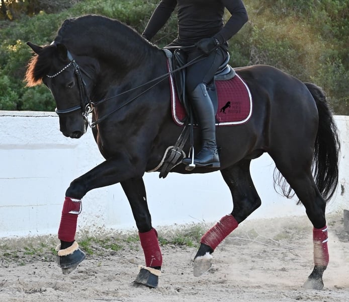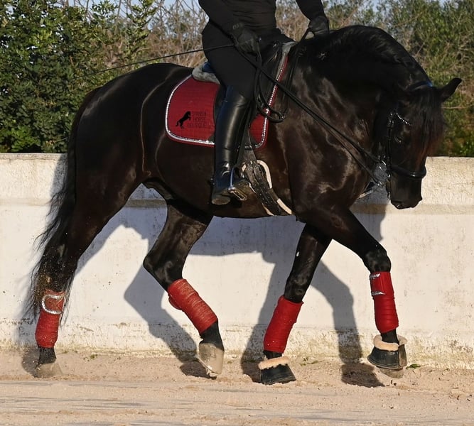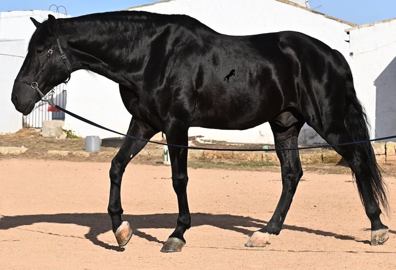 This purebred Menorquin stallion, born in 2017, once again demonstrated the calmness and coolness typical of a Menorquin during our photoshoot. Despite wind speeds of 70 km/h and gusts reaching 100 km/h, I was nearly brought to tears by the wind, making it difficult to see through the camera viewfinder, but he performed as if it were a beautiful day! When he stepped off the trailer, his blanket fluttered in the wind, yet he remained completely unfazed. Everything around him was crashing and plastic flapping, but he stayed focused. Despite the cold and the surroundings—he was transported to a different stable for better riding facilities for the videos—he was not "fresh" or hyperactive, but clearly happy to be working properly. His beautiful Baroque mane didn't withstand the storm, but it still showcases his flowing mane beautifully. Watching him work is truly a pleasure, and anyone lucky enough to ride him will feel like they're riding on cloud nine! He is almost a schoolmaster, offering a lot: lateral work in all gaits, pirouettes (started in canter), flying changes, extended canter, and counter-canter—all ridden without spurs. You can give him the reins even in canter, and he remains in rhythm, stretches nicely, and doesn’t even think about rushing uninvited. He has repeatedly proven his talent successfully in competitions and is not only premium-approved but has also been promoted from the regular stallion class to Recommended for breeding. He has offspring, but remains a well-behaved, sensible stallion without any nonsense. For those unable to keep a stallion, there is the option of castration on site! If you're looking for more variety than just riding, he's perfect—he also drives single in a carriage and has even pulled a wedding carriage for a couple! His pedigree is impressive, and his size is remarkable—standing at 174 cm (about 16.1 hh), he is currently the tallest Menorquin I have measured so far! He goes both in the field with a group and alone, and, typical of Menorquin horses, he handles terrain over rocks and stones with ease. Price reflects his quality! Location: Menorca. Videos and pedigree available upon request. I am happy to arrange an on-site pre-purchase exam, training, castration, transport, or even your travel arrangements if you wish to view him personally. Please see my website or contact me for details. Greetings from Spain!