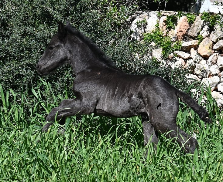 During a fierce storm, this Menorquín foal decided to come into the world. After all, one wants to become a sturdy representative of the breed ;) His sire stands over 170 cm and carries both Malboro and Nonte bloodlines! His dam is a Recomendado mare with Rostoll and Telma in her pedigree. Because he has a small white star and a subtle white marking on his hind leg, he is unique among the mostly black Menorquín foals. Since not all foals can stay, a forever home is sought for him! He is growing up perfectly, spending 24 hours a day outside on lush grass, which provides his mother with good milk. Thanks to the tough soils of Menorca and his 24-hour robust upbringing, he has excellent hooves and clear legs. He is already quite hardy, having endured a record winter with harsh weather—if it’s not pouring, then it’s storming! I sell the foal as follows: contract signing plus a deposit, after which you can choose his name (before the federation’s deadline). This year’s letter is T. Once the papers are issued, the second payment is due after successful weaning, followed by the third and final payment. The price includes official Menorquín registration, passport, and EU chip, with care until weaning. His current price is €3,500 (payable in three installments). Once weaned, I will organize transportation or there is the option of a rearing place on Menorca.