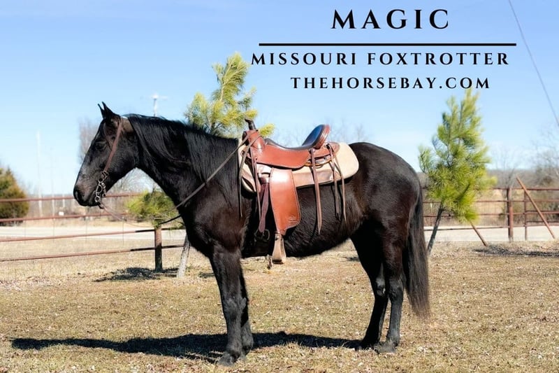 OPEN BIDDING ON THEHORSEBAY,COM. SALE ENDS ON 03/19. More information is available on the website, including an UTD vet inspection, Coggins, video, images, and the owner's contact information to ask questions, request information, or make arrangements to come to visit. Magic is a beautiful jet-black grade Missouri Foxtrotter standing at a perfect 14.3 1/2 hands. Magic has been trail-ridden by all age groups. He is very gentle. This stout gelding has numerous trail miles. He will ride alone or in a group. He has a very smooth 4-beat gait that can easily transition into a lope. He crosses rivers and goes through the woods with ease. He is a joy to ride. Magic has the most laid-back, friendly personality. He is easy to catch, lead, and load. You won’t want to miss this stout trail horse deluxe!