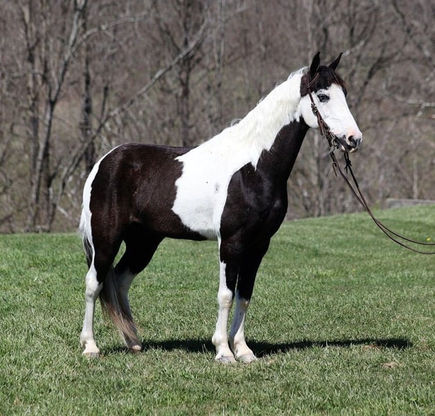 ONLINE AUCTION Place your bids at www.PlatinumEquineAuction.com Starting Bid $3500 Auction ends July 28th, 2024 Need a new saddle? Check out White Rock Saddles on our website or Facebook! Taco is an eye catching black/white tobiano, gelding that is standing 14.1hh and he is 10 yrs old. Taco has been on camping trips, picket line tied and hauled to several states. He will flatfoot walk on a loose rein or he can move on out if you ask. He has a smooth and natural 4-beat gait that anyone will enjoy riding on! He can gait on out around 10mph or walk on a loose rein as well. Taco has been shown at local fun shows in pleasure classes and seen it all from the bright lights to hearing those blairing loud speakers. Taco has seen it all and handles everything in stride! He has been exposed to all kinds of wildlife such as deer or turkey or other animals like cows or dogs and will go anywhere that he is asked too. He has been rode many miles in the mountains of Eastern Kentucky and encountered every obstacle possible on the trail. He will go up or down even the steepest slopes, across deep creeks, over downed trees, and over all types of rough terrain while still being sure footed. He has been rode in traffic, and is very traffic safe around cars, semi, log, and dump trucks. If you are looking for that special trail riding partner, then look no further!! Feel free to call Trevor Patrick 606-516-8069 with any questions. ONLINE AUCTION Place your bids at www.PlatinumEquineAuction.com Starting Bid $3500 Auction ends July 28th, 2024 Need a new saddle? Check out White Rock Saddles on our website or Facebook!