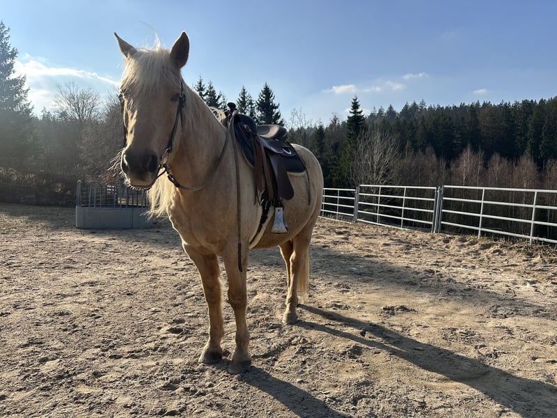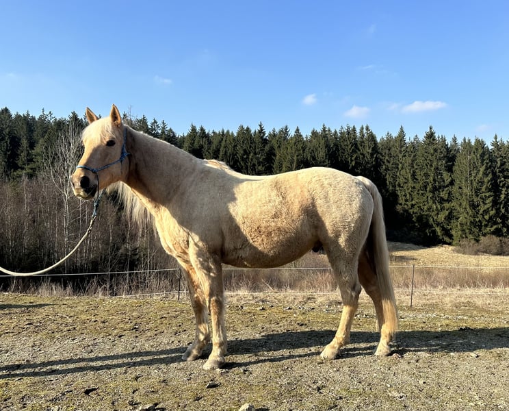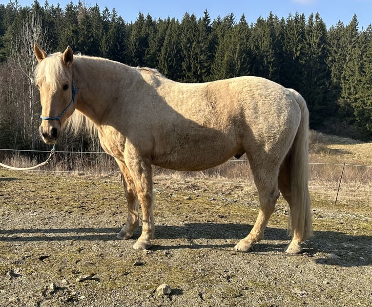 Beautiful Palomino gelding in the prime of his life. Excellent American bloodlines, solid build. Barefoot with very good hoof quality. He is very fearless and curious, loves trail riding and calmness exercises, is familiar with Parelli groundwork, and has spent a lot of time in the field. He enjoys being groomed and pampered and appreciates attention. Additionally, he loads calmly into the trailer. He is being sold well below value, as he has been out of training for approximately two years due to personal reasons. He has been worked with again for a few weeks now. He is also prone to cribbing (especially under stress and after feeding). At his previous home, he experienced a mild rearing incident when on 24/7 pasture without work, but this has fully healed (x-rays available). He can be ridden barefoot or, in rocky terrain, with hoof boots. He has tested negative for PSSM. He is kept in a mixed open stable with 24/7 hay from nets. He has been regularly vaccinated, had dental care, and been wormed. Although fearless and relaxed, he is not suitable for beginners, as he may take over leadership or stop working if not handled with experience. He is looking for experienced, patient, and loving owners and will only be sold to good, horse-friendly stabling. More details gladly provided during a phone call or in person. Upon request, his Freemax Western saddle and other accessories can be purchased together.