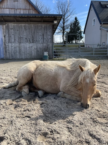 Wunderschöner Palominowallach im besten Alter. Beste amerikanische Abstammung, kräftig gebaut. Barhufer mit sehr guter Hufqualität, Er ist sehr unerschrocken und neugierig, liebt Trail- und Gelassenheitsaufgaben, kennt Arbeit nach Parelli und war früher viel im Gelände unterwegs.Er liebt es geputzt und betüddelt zu werden und freut sich über Zuwendung. Außerdem fährt er ruhig im Hänger. Er wird weit unter Wert verkauft, da er aus privaten Gründen ungefähr zwei Jahre aus dem Training war. Seit einigen Wochen wird er wieder gearbeitet. Außerdem ist er Aufsetzkopper (bei Stress und nach Futtergabe). Er hatte beim Vorbesitzer auf 24/7 Weide ohne Arbeit einen Reheschub, der aber vollständig ausgeheilt ist (Röntgenbilder einsehbar), so dass er ohne Probleme barhuf läuft bzw. im Gelände auf Schotter mit Hufschuhen. Er ist Pssm negativ getestet. Er steht im gemischten Offenstall mit 24/7 Heu aus Netzen. Er wurde regelmäßig geimpft, beim Zahnarzt vorgestellt und entwurmt. Obwohl er unerschrocken und cool ist, ist er kein Anfängerpferd, da er sonst die Führung übernimmt oder nichts mehr macht. Er sucht Menschen mit Erfahrung, Geduld und Liebe und wird nur in gute pferdegerechte Haltung verkauft. Gerne mehr bei einem Telefonat oder Treffen. Auf Wunsch kann sein Freemax Westernsattel und anderes Zubehör mit erworben werden.