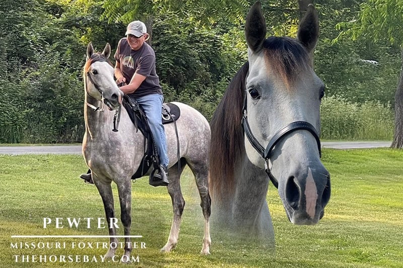 ONE IN A MILLION MISSOURI FOX TROTTER – TRAIL HORSE DELUXE FOR SALE – Pewter Pewter is a STUNNING 7-year-old 15.3 dapple gray Missouri Fox Trotter, a family-owned and loved, well rounded trail horse deluxe! THIS is the horse that everyone is searching for and rarely finds. We have owned Pewter for 2.5 years and he is only being offered for sale since my husband recently retired and we are downsizing. Pewter is a trail horse extraordinaire, with an ultra smooth, consistent gait. He can cover some ground if you like to ride with gaited horses, or walk slower with non-gaited breeds. Pewter does wonderfully in a crowd of horses, leading, in middle or back – easily separated, as he is not herd bound. He’s very independently minded. Camped extensively. He trailers beautifully (walking in the trailer himself, and backing out calmly, with or without a ramp), stands to mount quietly and is perfect for the farrier, clipping, bathing, saddling, bridling. Not spooky at all – exposed to many elements, including multi-use trail systems, wildlife, bicycles, joggers, cows, goats, sheep, dogs, donkeys, construction equipment, motorcycles, highway traffic, and gunshots. Pewter goes up the steepest slopes, across water and bridges, over downed trees, and through the roughest terrain. Trail ridden in extreme conditions with mud, snow, rivers, and sand. Climbs steep rocky terrain with ease. NO vices, ties, clips and bathes, goes through all obstacles like a champ. Solid as a rock, easy keeper. No health issues. Solid feet. Super friendly, with a very easy going personality – this horse loves people and companionship. Very easy to catch in the field (he comes to you), quiet and content in a stall, and great with all horses turned out in the pasture. His maturity and easy going personality make it easy for him to excel at everything we have asked of him. Up to date on all vaccinations, de-worming, teeth floated, sheath cleaned, current coggins, and four new shoes. Please note: We require the buyer to be accessible to PAYPAL OR VENMO to place a 10% deposit of the winning bid immediately following the end of the auction. No exceptions. If you do not have a PayPal or Venmo account prior to the end of the auction, please create one or make arrangements with a family member/friend who does. PayPal/Venmo deposits must be sent as ‘friends and family’ to avoid fees being applied. We require the remaining balance owed to be wire transferred before the end of the following business day. Bank information for the wire transfer, as well as our PayPal/Venmo details, will be provided during the initial phone call between us and the winning bidder. You are responsible for making transportation arrangements for the horse and must be picked up within two weeks of the auction, or additional boarding fees will ensue. Pewter is on our farm in Glenmoore, PA.