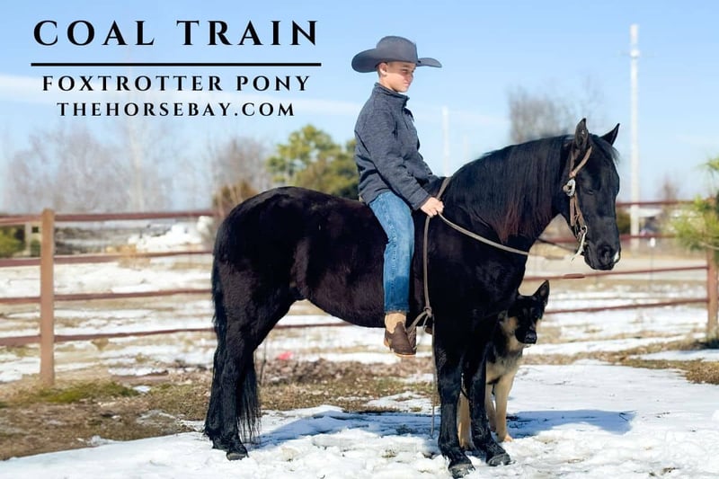 OPEN BIDDING ON THEHORSEBAY,COM. SALE ENDS ON 03/12. More information is available on the website, including an UTD vet inspection, Coggins, video, images, and the owner's contact information to ask questions, request information, or make arrangements to come to visit. Let me introduce you to Coal Train. He is a 8 year old fox trotting pony standing 12.2 and broke for any level of kid. He’s been trail ridden a million miles and rides like ones supposed to. He is jet black and gentle as a dog. Coal Train has a smooth 4 beat gait and an awesome lope. This little guy has a big heart and will out do most things big horses can do. Coal Train will also pull a buggy single or double. He’s the perfect fit for any kid wanting to ride or drive. He rides bare back or with a saddle. He is naturally gaited and will also walk right along. He loads and unloads easy and is great for the farrier. Both of my sons rode this pony all over the countryside without any troubles. He has no hump or buck to him. Coal Train has also won more blue ribbons then you can put in your truck at the local horse shows. If you’re looking for a kid to enjoy the trails with you, Coal Train is the pony for you!