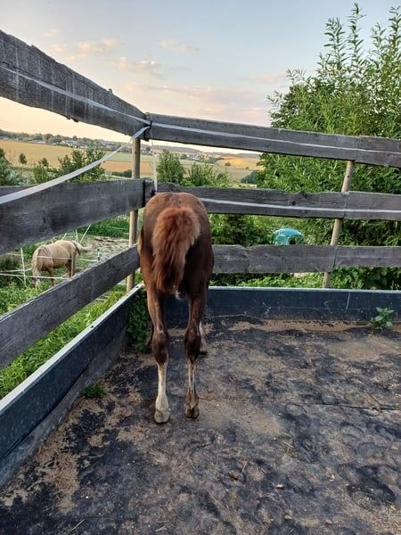 This confident, muscular, and compact mare with strong hock joints appears to be following in the footsteps of her parents and grandparents. Video 2 shows her powerful mother at 2½ years old. Untrained, the mare demonstrates a natural quality fox trot. Video 3 features her grandmother during the World Championships in the USA. Her grandsire is Gunslingers Velvet Vegas, the highest-rated and most-used breeding stallion in Europe. Her sire has already sired several quality foals and will be licensed soon. In her specialized gait, the Flat Foot Walk, Jolly effortlessly and springily swings her energy through her entire body, promising a comfortable ride (very natural rhythm and spacious movement). She is very ground-covering and diligent (ground-eating horse). She shows great potential as a show horse. Good show horses are also comfortable in the terrain, offering high riding comfort. Video 4 clearly illustrates the hind leg (hock) delay in the Flat Foot Walk, which is essential for a high-quality, breed-specific fox trot. She can be registered in the USA this fall and will come with a purple European breeding passport issued by the specialized breeding association for Missouri Foxtrotters. The veterinarian has identified her as a chocolate buckskin. See also my homepage: http://www.taunus-foxtrotter-ranch.net