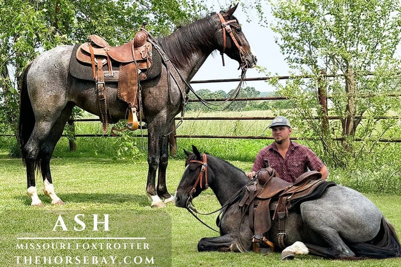 Ash to 3-letnia, wkrótce 4-letnia niebieska roan Fox Trotter. Ash ma jedną z najsłodszych osobowości, jakie można znaleźć! Jest bardzo łatwa do złapania i zawsze pragnie być kochana. Jeździłem na Ash przez wiele mil szlakami i zabrałem ją na nocne wyprawy campingowe. Ash ma bardzo gładki czterotaktowy chód i ładny galop. Wsiada i zsiada perfekcyjnie i ma bardzo łagodny charakter. Prawie każdy może jeździć na niej z pewnością siebie. Cofnie się i dobrze reaguje na wodze na szyi, a także może jeździć samodzielnie lub z innymi. Nie ma żadnych złych nawyków. Ash potrafi również leżeć! To bardzo fajny koń, który będzie towarzyszył komuś przez całe życie. Ash ma 14,2 ręki i prawdopodobnie osiągnie 15 rąk.