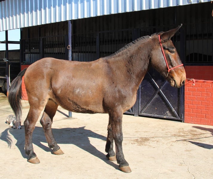 All of our noble mules have been ridden and are safe for traffic, not skittish, and regularly participate in Romerías and Fiestas (Spanish festivals), so they are accustomed to noise and commotion. The mother is a Percheron mare, which explains his sturdy build. He is gentle with the rider, making him suitable for relaxed rides. If desired, he can stay with us for further training and schooling. International transport can be arranged.