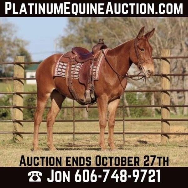 ONLINE AUCTION Place your bids at www.PlatinumEquineAuction.com Starting Bid $3500 Auction ends October 27th, 2024 Need a new saddle? Check out White Rock Saddles on our website or Facebook! Jesse is an 8 year old, 15 hand John mule. He is a well trained, well rounded ranch mule. He has worked in many areas on the ranch from gathering and sorting cattle, to dragging calves to the fire, to loading trucks. He keeps his cool in busy situations and handles himself nicely. He walks and jogs nicely and he has a very comfortable and easy lope. Jesse neck reins very well. He backs and side passes as well. You can open and close gates on him too. He is excellent on the trails. Surefooted and he gives you a confident feeling on all types of terrain. Jesse has lead a smaller pack string. He has spent a couple summers at cow camp and seen that big country and does well with it. If you’re looking for a solid mule to get you down the trail or to put in a days worth of work, Jesse is the mule for you! For more information, please call Jon Waugh 606-748-9721 Located in Brooksville, KY. ONLINE AUCTION Place your bids at www.PlatinumEquineAuction.com Starting Bid $3500 Auction ends October 27th, 2024 Need a new saddle? Check out White Rock Saddles on our website or Facebook!