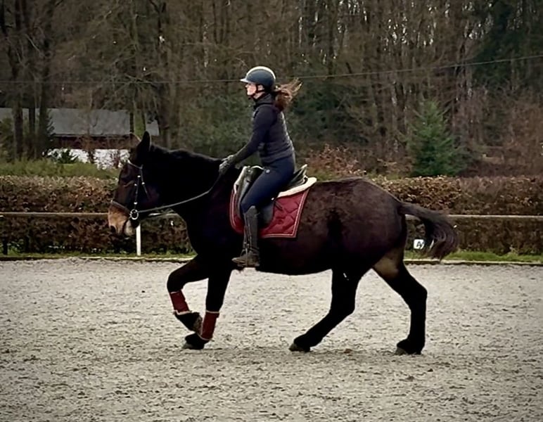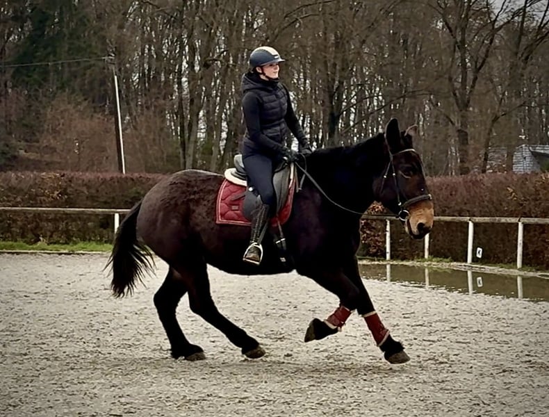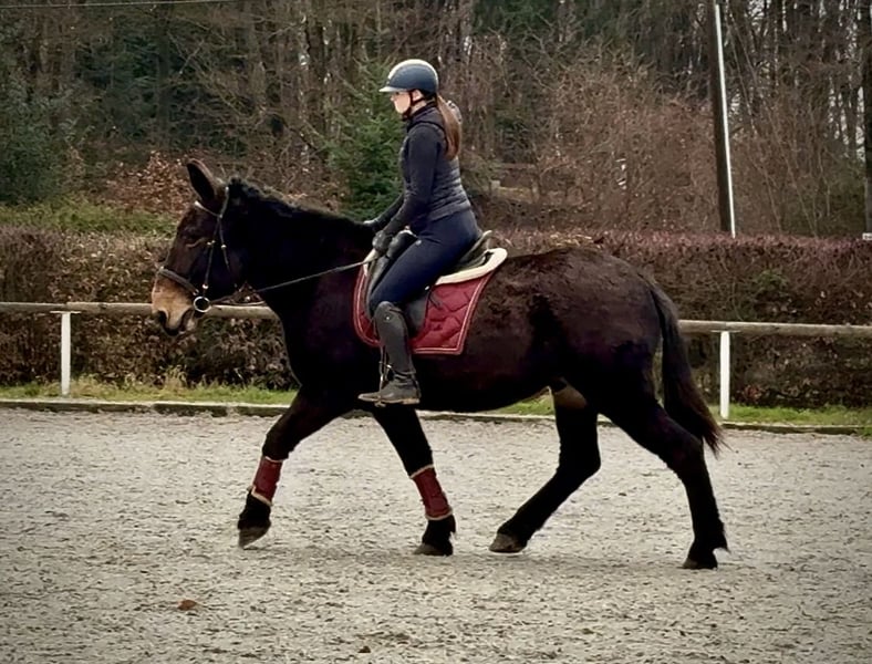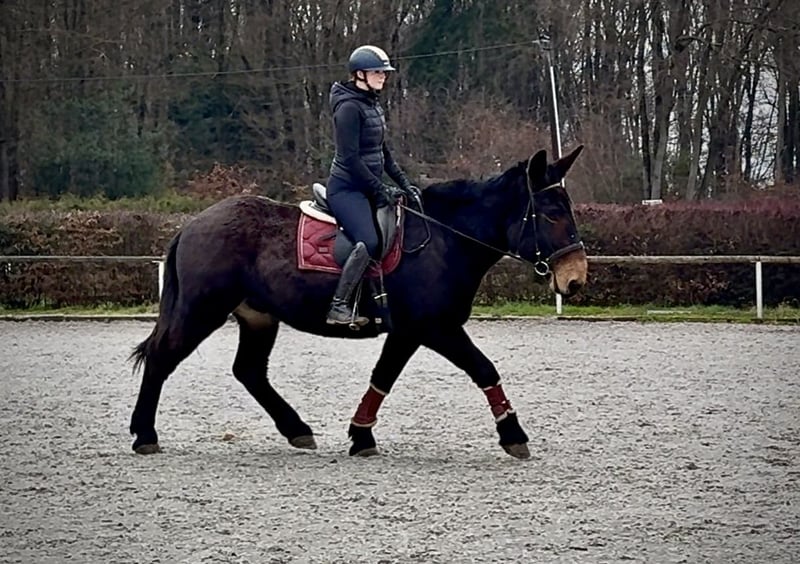 Name: Jazzy Breed: Mule Gender: Gelding Date of Birth: April 7, 2019 Age: 6 years Height: 1.60 m (approximately 16.1 hh) Color: Dark Brown Pedigree: Documentation available Temperament: Friendly, reliable, intelligent, eager to learn, brave, patient Training/Suitability: Leisure riding, therapy work Trail Experience: Dependable, fearless, suitable for both alone and in groups Health: Dewormed, vaccinated, barefoot, eczema-free, teeth checked, osteopathically treated Stabling: Box stall, open stable Special Features: Very comfortable rider seat, farrier and loading-friendly, herd-compatible Please note that the described qualities are based on our personal assessment and do not constitute a guarantee. Price: €7,500 (gross price) Have we piqued your interest? To give you a better impression of Jazzy, we are happy to send you a riding video. Of course, we are available for a detailed description of the horse, personal consultation, and to answer all your questions by phone. Please feel free to contact us anytime via WhatsApp or call us at: +49 151 19487595 Our calling hours are daily from 7:00 AM to 1:30 PM and from 8:00 PM onwards. We look forward to hearing from you! A clinical or radiological pre-purchase examination can be performed by your veterinarian of choice. Jazzy can be safely and comfortably delivered to his new home. We handle all necessary preparations and transport to ensure your new horse arrives stress-free, well cared for, insured, and in good health. Currently, we offer a carefully selected range of sale horses. With us, you will surely find your dream horse. Feel free to visit our website at: www.marvinsroyalhorses.de Dear customers, we are happy to introduce our horses and offer grooming, tacking, lunging, ground work, and trial riding in the riding hall, on the arena, or in the field to help you get to know your new family member. The cost is €40 per horse and €30 for each additional horse, which will be refunded upon purchase. Our address: Ferdinandgrube 50 53577 Neustadt-Wied Google Maps: marvinsroyalhorses