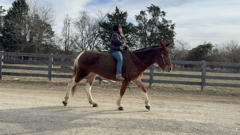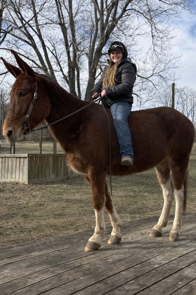 Her personality is one of her greatest assets. Joanne is easy to get along with, kind-minded, and consistent, making her a pleasure to have around the barn as well as out on the trail. She carries herself with a calm assurance that reflects experience and good handling — a mule that simply does her job and does it right.