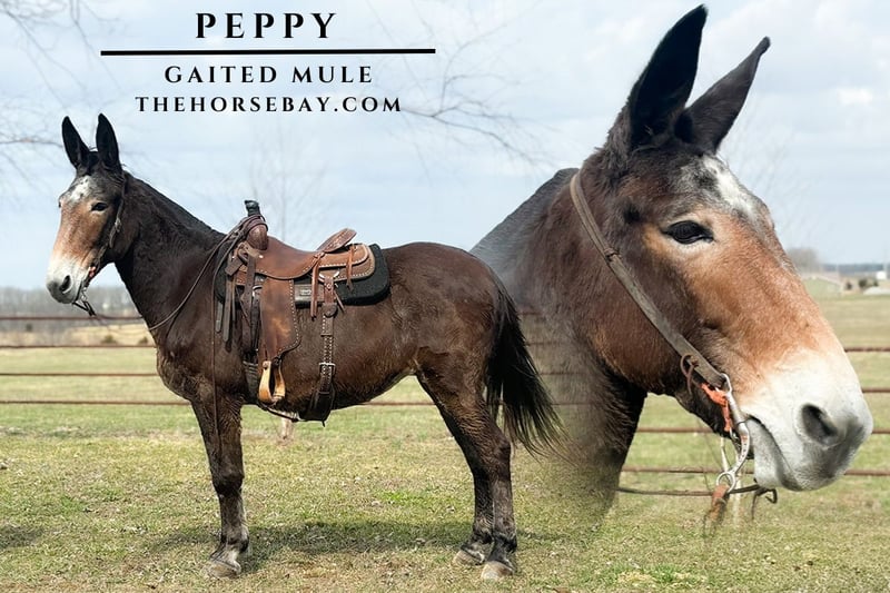 Meet Peppy, the epitome of safe, gentle, and reliable. At 10 years old, she is in the prime of her life, standing a stout 15.1 hands with excellent bone and foot structure. Peppy is a beautiful roan molly that brings a smooth, easy-going gait to the trails, ensuring a comfortable ride for hours. Peppy is Beginner-friendly, gentle, and quiet. She is the type of mule that will take care of her rider, whether they are a novice or a youth. She has extensive trail miles, crosses water, bridges, and deadfall with confidence. She is traffic safe (tractors, ATVs, cars) and will lead or follow in a group. Peppy has no buck, no hump, no kick. She is trustworthy and patient. Peppy handles her ears, stands to mount (from either side), bathes, loads, and is a favorite for the farrier. She steps out with a natural, smooth 4-beat gait. Peppy is a “been there, done that” mule who loves attention and is as honest as they come. She is a hard-to-find mule who offers a calm, enjoyable experience every time you head out. Peppy has a nice one-handed neck rein. She is very easy to handle, and she will go anywhere you point her!