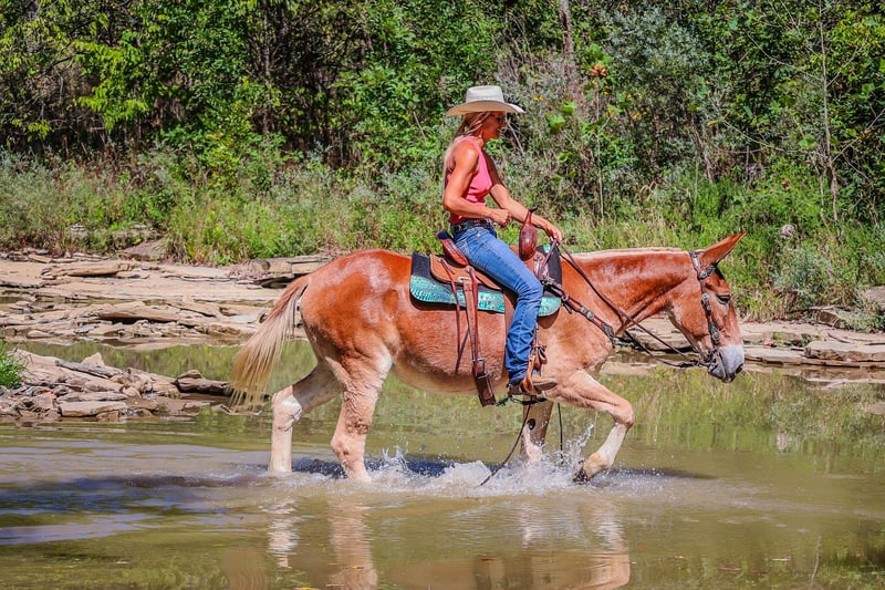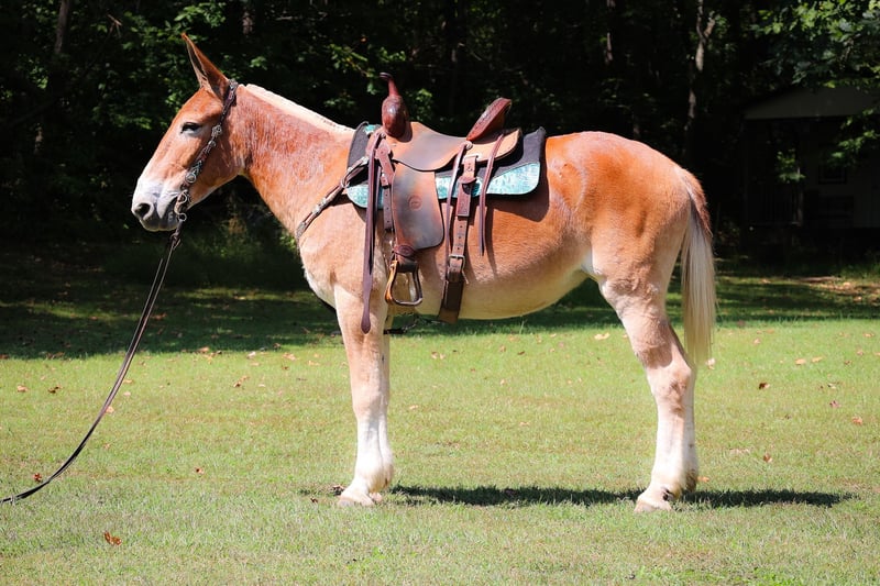 ONLINE AUCTION Place your bids at www.PlatinumEquineAuction.com Starting Bid $3500 Auction ends September 29th, 2024 Need a new saddle? Check out White Rock Saddles on our website or Facebook! This is June, a FAMILY, YOUTH, AND BEGINNER FRIENDLY SORREL MOLLY MULE. This mule is broke to work, ride, and she will hook double or single. She is 15.1 hands tall and 11 years old. She has been ridden by children to school and has been driven on the main roads in a top buggy, cart, and wagon. She is traffic safe and not spooky of fast traffic, tractors, four wheelers, or side by sides. She is quiet and very easy to catch. She stands to hook, harness, tack, mount, and groom. She stands tied, loads, bathes, and hauls with no fuss at all. This mule has been in the woods and used to skid logs, she has pulled the manure spreader, all hay machinery, and the big hay wagons. She is as honest as you get. She is very easy to ride and will lope off quietly with no hump and no buck. She is easy to stop, she handles both ears, and picks up all four feet. She will cross fast rushing water with confidence and rides out alone bravely. She will also ride in a group and doesn’t care if she is in the lead or bringing up the rear. She is fine with dogs trailing her heels. This mule is safe, gentle, and has lots of experience under saddle and under harness. She is B-R-O-K-E!! Don’t miss out on the hard to find kind of mule. Her new owners will appreciate how docile, civilized, and patient she really is. She is Located in Flemingsburg, KY. Contact HH Horses Erin 304-238-4155 with any questions. ONLINE AUCTION Place your bids at www.PlatinumEquineAuction.com Starting Bid $3500 Auction ends September 29th, 2024 Need a new saddle? Check out White Rock Saddles on our website or Facebook!