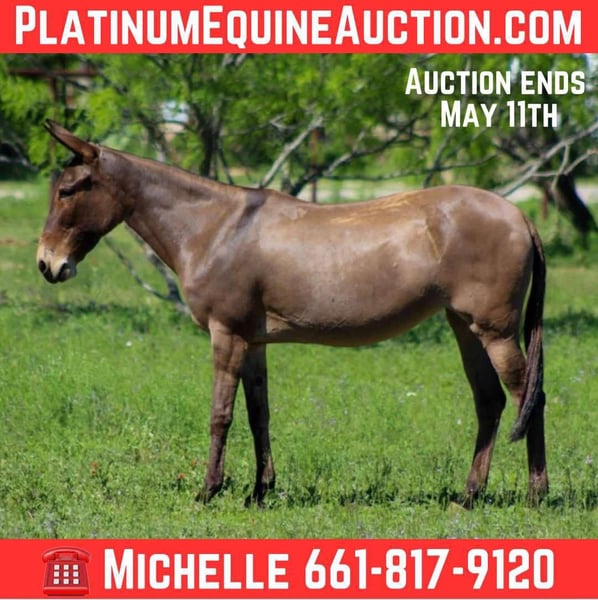 ONLINE AUCTION Place your bids at www.PlatinumEquineAuction.com Starting Bid $3500 Auction ends May 11th, 2025 Need a new saddle? Check out White Rock Saddles on our website or Facebook! Meet Chica! I guarantee you won’t find a broker and cooler little mule than this gal! They say good things come in small packages, and that couldn’t be truer! At just 8 years old and standing 13 hands tall, don’t let her size fool you—she’s got a heart of gold and can do everything a big mule can. Chica is safe for absolutely everyone, from kids to even grandma and grandpa, so you can ride her with peace of mind! She’s one of the nicest mules I’ve ever seen, and with her great attitude, you don’t need to be a mule person to enjoy her. She would be perfect for a first-time mule owner as well. This little lady is extremely well broke and has a fancy handle on her. She’s one-handed broke with a fantastic neck rein, and she’ll walk, trot, and lope perfect circles, always picking up the correct leads and stopping on a dime. Chica would make an exceptional little mule to take to the show pen—she’s just that broke and that cool! Need to open or close gates? No problem—she’ll side pass right over to them. You can even ride her with just a piece of leather around her neck! Chica is used to it all: carrying flags, crossing tarps, and she’s even comfortable shooting guns off her back. We have heeled steers on her in the roping pen, and she stands in the box without a hitch. When it comes to trail riding, Chica is a blast! She’s been ridden on miles and miles of trails and will gladly go wherever you point her. She crosses water, logs, and hills with ease and has been ridden down busy streets and highways. I haven’t met a better mule than sweet Chica! She’s great with kids and will happily pack them wherever they want to go. Chica fits absolutely any level of rider, and everyone who hops on her has a blast. I just know her new owners are going to love her as much as we do! Chica is great with clippers, loads and unloads easily off the trailer, and is a breeze to saddle and bridle. She stands wonderfully for the farrier, is great for baths, and even stands in cross ties. Plus, she’s an easy keeper and currently barefoot. Don’t miss out on this once-in-a-lifetime mule—Chica is truly one of a kind! If Chica sounds like she is a fit for you please give us a call with any questions you may have we would love to chat with anyone interested in her. Schedule a time to come meet her but if you can’t find time in your plans don’t worry we do offer FaceTime showings also. We can arrange shipping anywhere in the world including Hawaii or Canada and anywhere in between. We have a list of reputable haulers that can get her safely to your doorstep. ONLINE AUCTION Place your bids at www.PlatinumEquineAuction.com Starting Bid $3500 Auction ends May 11th, 2025 Need a new saddle? Check out White Rock Saddles on our website or Facebook!