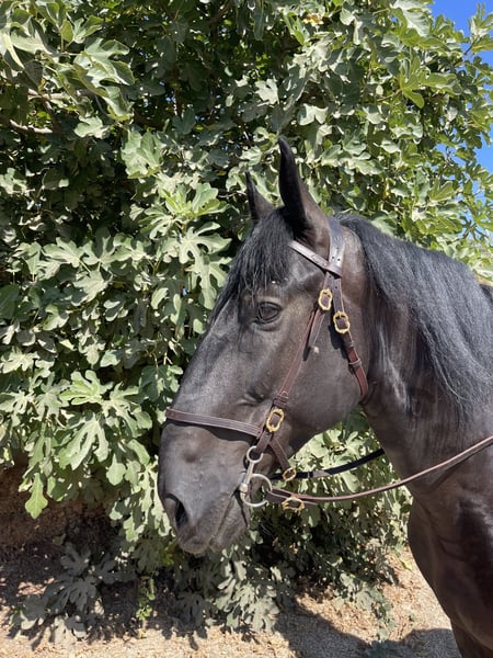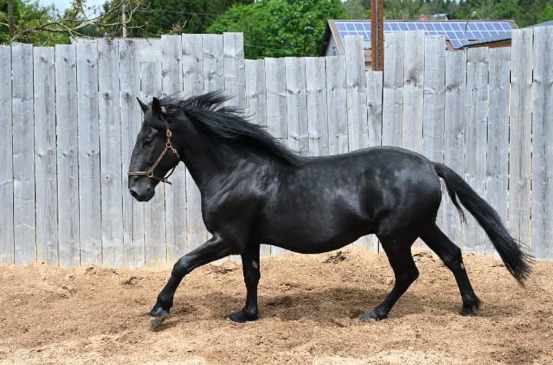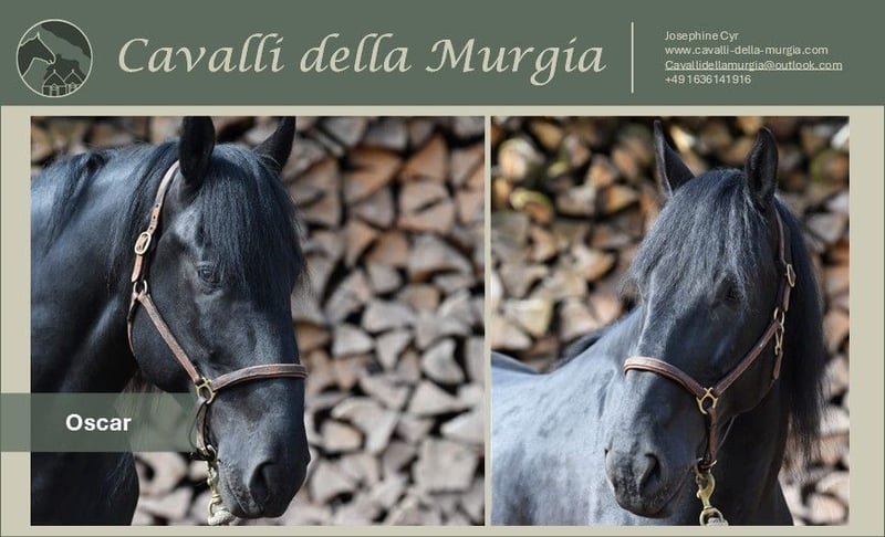 -Oscar- Oscar is an impressive Murgese gelding of a baroque type, whose appearance is truly unforgettable. With his strong, solid build, a characteristic head profile, and an approximate height of 16.1 hh, he embodies the classic conformation of this breed. Typical for the Murgese, Oscar has a calm, balanced temperament, remaining attentive and eager to work. Beneath his robust exterior lies a sensitive character – he is a fine fellow, very human-oriented and affectionate. Oscar came to us in 2020, learned the basics of young horses, and spent his youth grazing on pasture until the age of four and a half. During the winter of 2022/23, he began training in lunging and handling. Today, he is comfortable with walk, trot, and canter both on the arena and in the field, is traffic-safe, and proves to be reliable and versatile under saddle. He responds excellently to voice commands and can be guided well from a distance, making him an ideal school horse. Additionally, he performs all lateral movements in walk and trot and is beginning piaffe work. Oscar is well-trained – leading, loading, and farrier work are no problem. Thanks to his pasture upbringing, he is electric fence safe. The foundation has been carefully laid, and with experienced handling, he can develop into a truly stunning baroque horse. X-rays are available and can be viewed upon request. We are happy to assist you with planning a visit to his homeland in Apulia, the purchase process, transportation to Germany, and a pre-purchase examination. Further photos and videos are available upon request. Has Oscar piqued your interest? We look forward to your message at www.cavalli-della-murgia.com.