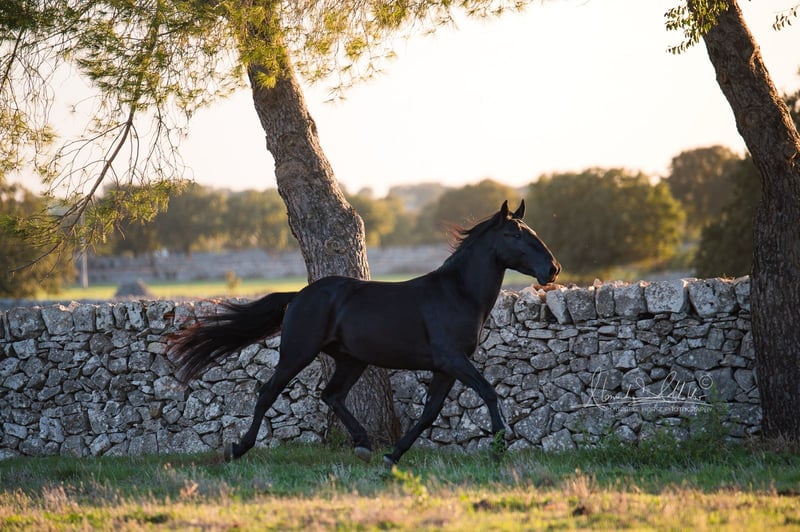 Castratie is al inbegrepen in de aankoopprijs! Salvador P.M. is een van die paarden die we bijna vanaf de geboorte hebben mogen begeleiden. Hij is opgegroeid op de grote weiden van de fokker en kwam begin dit jaar in de stallen om hem voor te bereiden op zijn verdere leven. En voor deze fokkerij gebeurt dat op een rustige manier en in het tempo van het paard. De basis van de jonge paarden is gelegd en de verdere training wordt leeftijdsgericht voortgezet. Salvador doet netjes mee en toont daarbij nieuwsgierigheid en openheid. Salvador is zeer typisch voor zijn ras, met een vleugje elegantie en een mooi, niet te overdreven hoofdje. Hij is heel lief en vriendelijk, maar brengt toch veel esprit mee, wat hem tot een ideale toekomstige metgezel maakt voor een betrokken familie of een enthousiaste recreatieruiter. Ook in de barokke dressuur kunnen we hem goed voorstellen – hij beschikt over goede bewegingen in het algemeen. Hij is momenteel 154 cm hoog – zijn uiteindelijke maat wordt geschat op ongeveer 160 cm. Salvador is nog hengst, maar kan op verzoek gecastreerd worden (al inbegrepen in de prijs). We kijken uit naar vragen – meer informatie en video’s zijn uiteraard mogelijk. Wil je Salvador persoonlijk ontmoeten? Neem dan mee op reis naar zijn thuisland Apulië. Hij brengt ook röntgenfoto’s mee; bij serieuze interesse zijn deze in te zien. Daarnaast regelen wij alles voor jou – klinisch aankooponderzoek, afhandeling van het koopcontract, transport naar jouw thuisstal, enzovoort. - namens de Italiaanse Murgesenvereniging A.N.A.M.F.