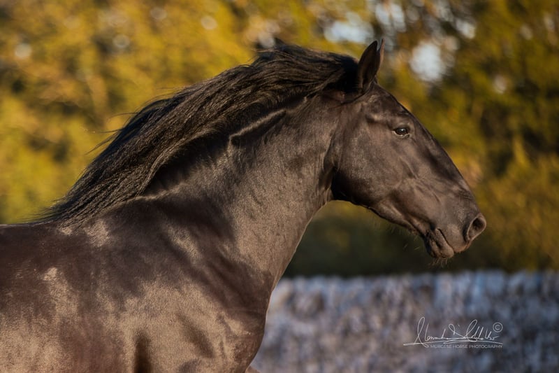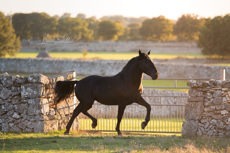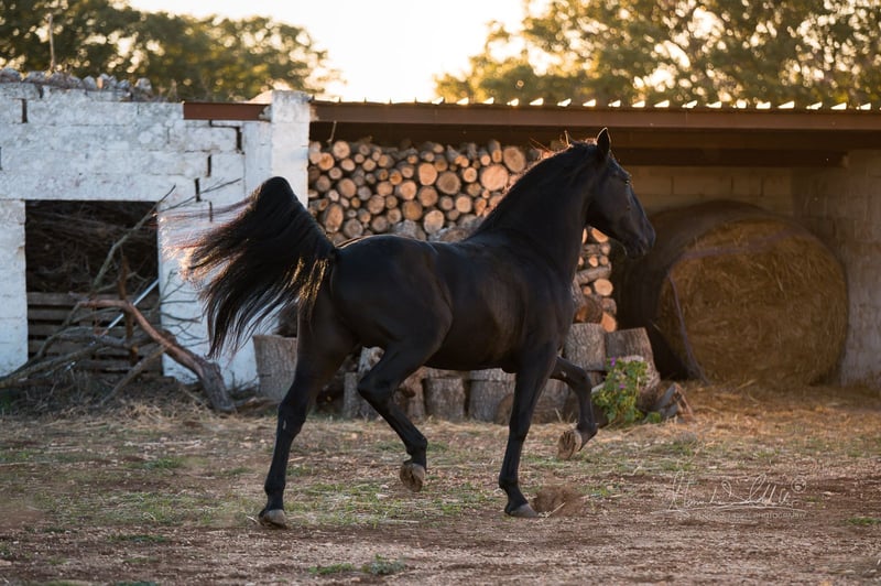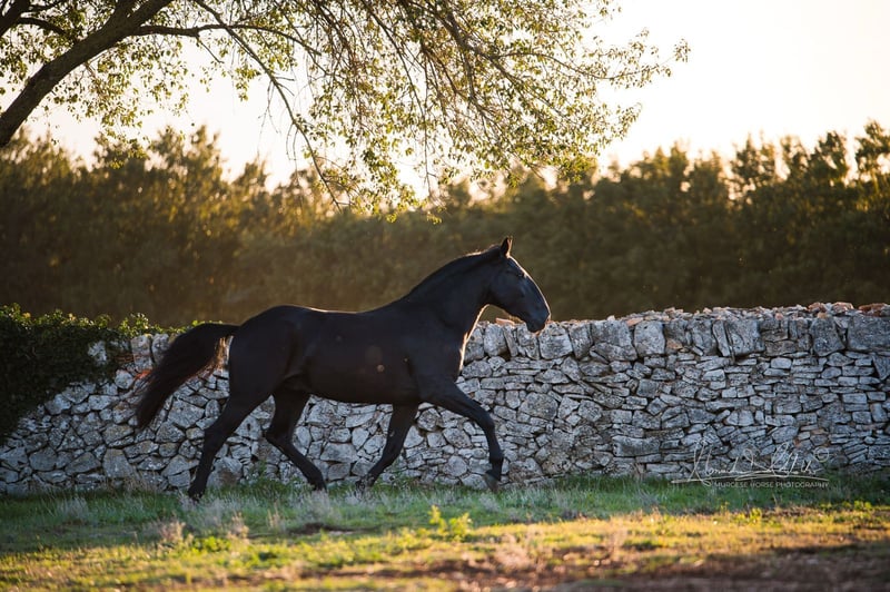 Castratie is al inbegrepen in de aankoopprijs! Salvador P.M. is een van die paarden die we bijna vanaf de geboorte hebben mogen begeleiden. Hij is opgegroeid op de grote weiden van de fokker en kwam begin dit jaar in de stallen om hem voor te bereiden op zijn verdere leven. En voor deze fokkerij gebeurt dat op een rustige manier en in het tempo van het paard. De basis van de jonge paarden is gelegd en de verdere training wordt leeftijdsgericht voortgezet. Salvador doet netjes mee en toont daarbij nieuwsgierigheid en openheid. Salvador is zeer typisch voor zijn ras, met een vleugje elegantie en een mooi, niet te overdreven hoofdje. Hij is heel lief en vriendelijk, maar brengt toch veel esprit mee, wat hem tot een ideale toekomstige metgezel maakt voor een betrokken familie of een enthousiaste recreatieruiter. Ook in de barokke dressuur kunnen we hem goed voorstellen – hij beschikt over goede bewegingen in het algemeen. Hij is momenteel 154 cm hoog – zijn uiteindelijke maat wordt geschat op ongeveer 160 cm. Salvador is nog hengst, maar kan op verzoek gecastreerd worden (al inbegrepen in de prijs). We kijken uit naar vragen – meer informatie en video’s zijn uiteraard mogelijk. Wil je Salvador persoonlijk ontmoeten? Neem dan mee op reis naar zijn thuisland Apulië. Hij brengt ook röntgenfoto’s mee; bij serieuze interesse zijn deze in te zien. Daarnaast regelen wij alles voor jou – klinisch aankooponderzoek, afhandeling van het koopcontract, transport naar jouw thuisstal, enzovoort. - namens de Italiaanse Murgesenvereniging A.N.A.M.F.