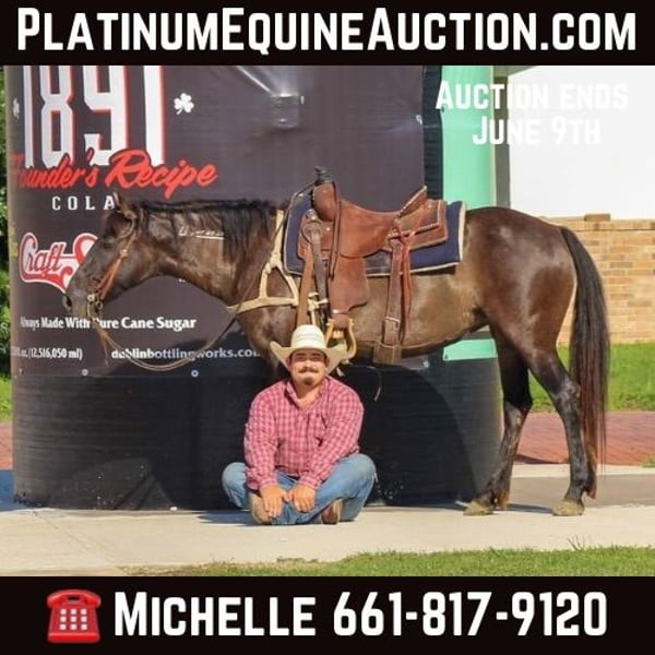 ONLINE AUCTION Place your bids at www.PlatinumEquineAuction.com Starting Bid $3500 Auction ends June 9th, 2024 Need a new saddle? Check out White Rock Saddles on our website or Facebook! Here’s your chance to own a piece of American History! Kesha is a 2015 Model Grulla BLM Branded Mustang Mare standing 14 hds tall . Kesha is from the Maverick-Medicine HMA in NV , she was captured 2/11/2018 . This little mare is classy , stout built and as cute as a button . She competed at the 2020 Fort Worth Mustang Makeover. She is absolutely a barn favorite with a ton of personality she’s the first one to meet you at the gate and loves kisses on the nose ! Kesha is very well broke and always stay calm, cool and collected no matter the situation. We have rode over on many trails at the state park , with campers on the trails , wildlife and she never batted an eye .She is the point and go type down the trails , she goes up and down hills , crosses logs , bridges and water . She loves to swim to in the river . We have taken her on several cruises around town with traffic , and semi trucks she handled it like a seasoned veteran. Kesha will ride out by herself or in a group , she can be in the front , middle or back she doesn’t mind and just stays where you place her . She will walk trot and lope circles in the arena or out in the field with no issues at all . She has a perfect little short lope to her and will lope in the palm of your hand . We have rode her bridle less out in the pasture she works off your seat very well . Shes an exceptional little trained mare that everyone enjoys taking on rides . Kesha is ABSOLUTELY GENTLE all the time from the ground to her back, she has impeccable ground manners . We have also used her to bring up roping cattle , load trucks on her and sort cattle on . Shes user friendly and will suit any level rider . Theres no job to big or small for her . She stands for the farrier (currently barefoot ) stands tied , trailers great , easy to catch . Gets along with other horses In the barn or in the pasture. Watch her video and you will fall in love. Shipping available worldwide including Hawaii, Canada and other countries we can help you find a reliable transport that will get her there safely. Located in Stephenville, TX. FMI contact M$ Performance Horses Michelle 661-817-9120. ONLINE AUCTION Place your bids at www.PlatinumEquineAuction.com Starting Bid $3500 Auction ends June 9th, 2024 Need a new saddle? Check out White Rock Saddles on our website or Facebook!