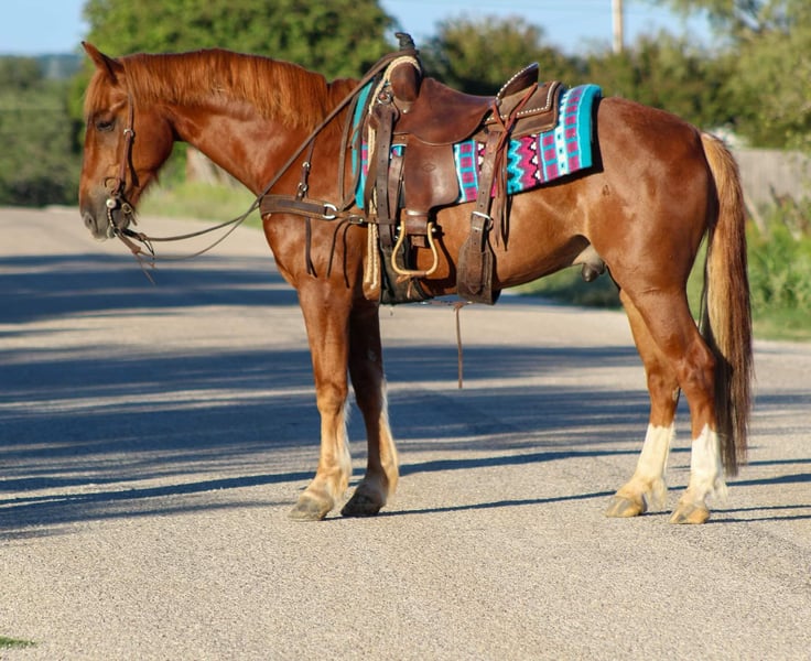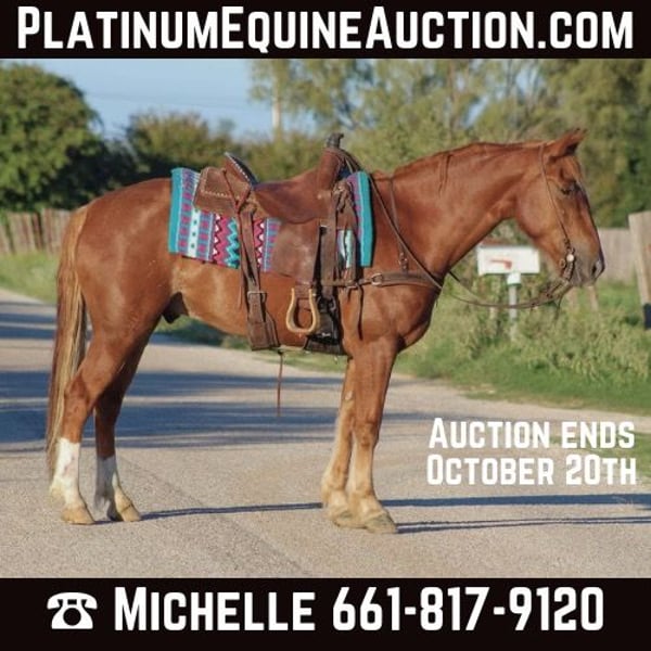 ONLINE AUCTION Place your bids at www.PlatinumEquineAuction.com Starting Bid $3500 Auction ends October 20th, 2024 Need a new saddle? Check out White Rock Saddles on our website or Facebook! Let me introduce to you Manny the mustang ! Here’s your chance at a piece of American history ! Hes the best color in the world sorrel and just happens to be a great American mustang to boot ! Manny is 9 years old and standing 15.1 hds tall . He is from the Salt Wells HMA in Wyoming.Manny is the barn favorite and the kids never forget there cookies when coming to see him . He’s a people’s horse he loves attention and is always the first one to put his head over the gate when you come into the barn . He is truly one in a MILLION. Manny was a hit at the Fort Worth stockyards on a busy Friday evening. He wasn’t bothered by the crowds of people petting him and taking pictures with him , heavy traffic and lots of loud music . He will go down the trail with no issues at all. Like most mustangs he’s sure footed and tough he can go up any mountain and take care of you . He loves to go swimming in the river and playing in the water . He will cross logs , bridges , and goes through thick brush . He is brave and confident down the trails . Not only is Manny an exceptional trail horse he rides fantastic in the arena he breaks at the poll , and has a great stop on him . He is laid back he will walk , trot and lope beautiful circles. Manny would also excel in the endurance and eventing world . We have led our neighbor kids around on him who are 3 and 4 years old he takes care of them and is always careful around the kids . He is absolutely what everyone needs when looking for that new horse that the WHOLE family can enjoy. Manny is absolutely 100% beginner safe. We trust Manny with everyone from the smallest kids and beginner riders . He’s a dream from the ground to his back always taking care of everyone . He’s used to wildlife, cattle and dogs . Manny is one you don’t want to miss out on! Contact us to come try him, or we can set up a FaceTime also. If you need help with transport don’t hesitate to ask we have a list of reputable haulers that can get him safely to your doorstep world wide. Located in Stephenville, TX. Contact M $ Performance Horses Michelle 661-817-9120. ONLINE AUCTION Place your bids at www.PlatinumEquineAuction.com Starting Bid $3500 Auction ends October 20th, 2024 Need a new saddle? Check out White Rock Saddles on our website or Facebook!