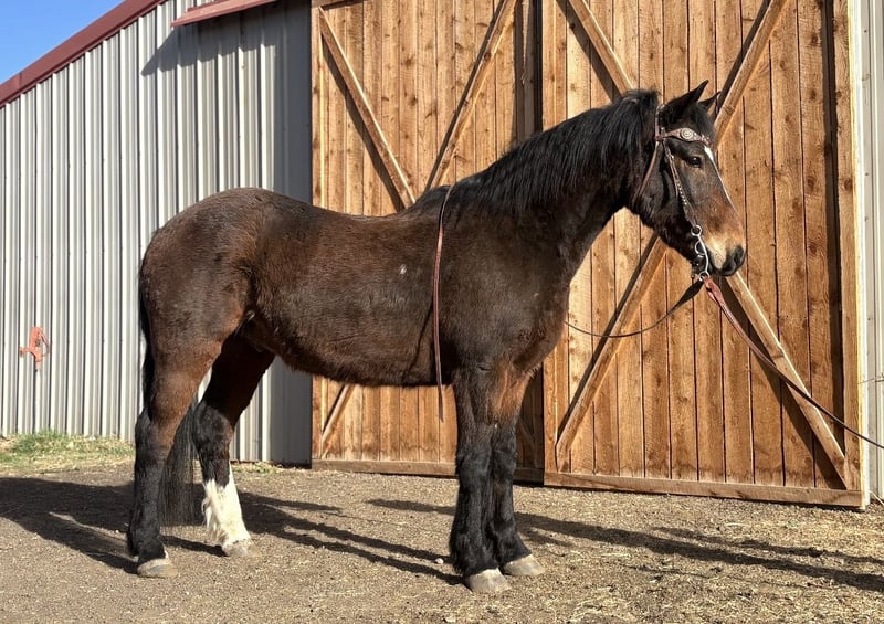 "AVAILABLE ON ONLINE HORSE AUCTION AT www DOT MagicHorseAuction DOT com BIDDING OPEN NOW thru TUESDAY | APRIL 14TH! BUY IT NOW AVAILABLE! *Final price will be determined on auction site* CONSIGNOR CONTACT INFO: Dynamite horses #970-632-3644 LOCATION: fort Collins, CO " "Cuervo is a 6-year-old bay mustang gelding standing at 14.1 hands, with a stocky build and eye-catching chrome markings that add to his charm. He’s got a bit of a nervous streak on the ground—he’s easily spooked of people on the ground and needs a calm, experienced handler who can approach him gently and confidently, because he might act like he’s seen a ghost every time you open his stall door. But once you’re in the saddle, Cuervo shines like a star. He’s incredibly smart, quick, and athletic—one of those rare horses that can really wow you with his skills. He’s free lunged over fences as high as 4’6” with ease, showing impressive power and grace. His agility is off the charts; he can spin tight circles that dig into the dirt, sidepass smoothly at all gaits (walk, jog, and lope), and turn faster on the rail than many cutters you’ll see out there. Cuervo can also perform six flying lead changes straight down the center line and stop instantly on command. On top of all that, he’s got a finished neck rein and responds beautifully to leg cues, making him a true pleasure to ride. He’s also seasoned on the trail, unfazed by bikes, runners, and even the chaos of downtown traffic. Bridges, lakes, rivers, tunnels—you name it, Cuervo’s crossed or gone through it without hesitation. The only real challenge with Cuervo is his nervousness on the ground, but if that wasn’t a factor, he’d be perfect even for the smallest riders, the more we work with him the better he gets and we truly believe with a forever person he will learn confidence on the ground as well. He’s genuinely a cool horse to ride and would be #1 on my list to keep if I had an extra spot for a personal horse. Come check him out and feel free to watch his video or get in touch with any further questions! "