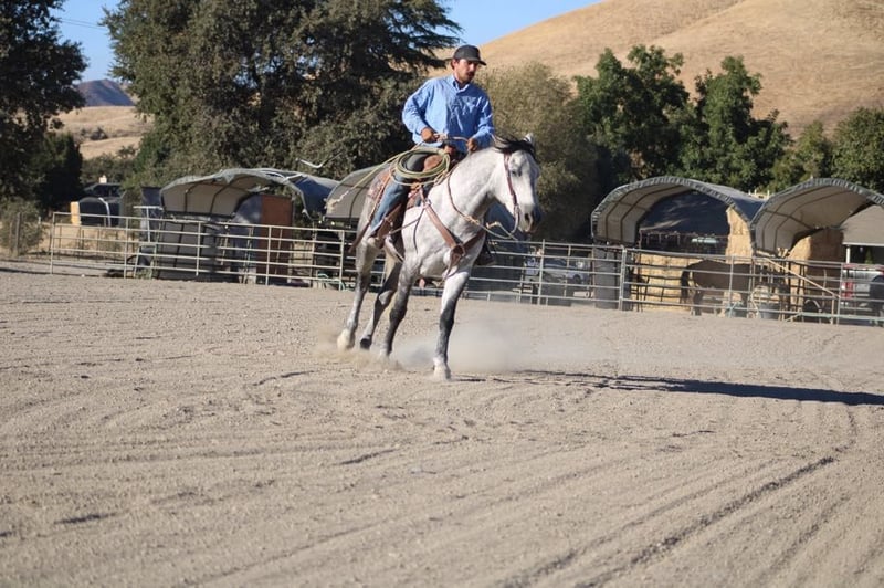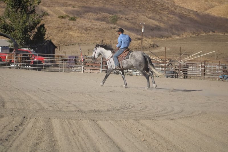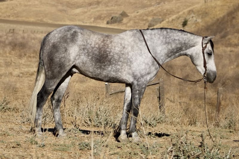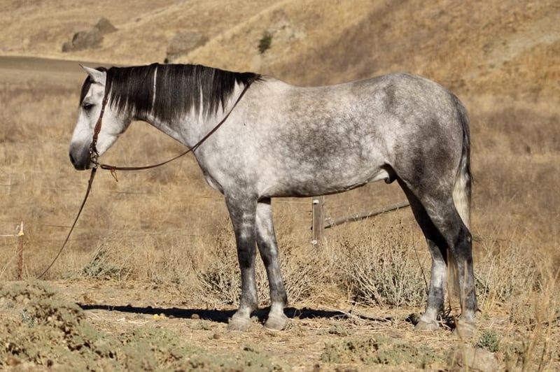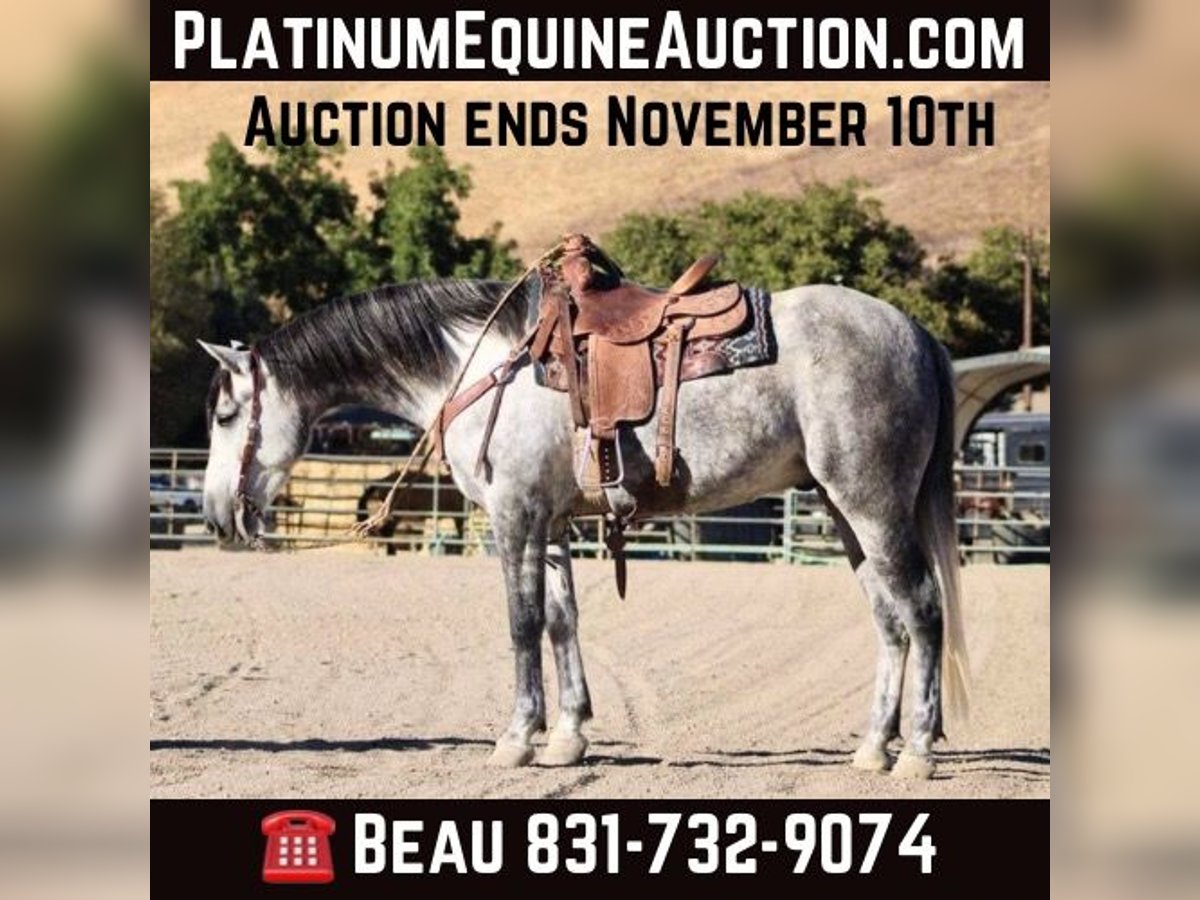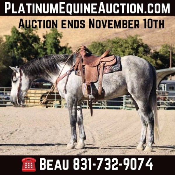 ONLINE AUCTION Place your bids at www.PlatinumEquineAuction.com Starting Bid $3500 Auction ends November 10th, 2024 Need a new saddle? Check out White Rock Saddles on our website or Facebook! Jorje is an amazing dapple gray mustang gelding is the epitome of gentle, standing at a proud 16 hands and exuding kindness with every movement. Jorje gracefully conquers the steepest hills and navigates rocky terrain with ease, embodying both strength and elegance. Renowned for his extreme gentleness, he is safe for absolutely anyone to ride, making him a prized companion in any equestrian setting. Not only has he gathered and branded countless cattle with unwavering dedication, but this exceptional horse also showcases his talents as a proven seasoned head horse. Solid in the box, he pulls like a dream and faces on a dime; whether you’re running ten or twenty head in succession, he rates cattle impeccably while delivering consistent shots each time. Jorje accolades include winning jackpots, buckles, and substantial prize money—a testament to his competitive spirit evident during events such as the Californian ACTRA roping finals where he performed rock solidly as always. Ridden by participants ranging from novice to advanced riders alike, he remains adaptable and competitive across all skill levels. Jorje has also been started English, he shows remarkable potential to be shown in the hunter jumper, or dressage. Beyond his athletic prowess—he clips easily, ties without fussiness, is cooperative for the farrier—all while possessing an amiable personality that makes him simply delightful to be around. This gelding exhibits absolute comfort around tarps, balls, or traffic; truly superior traits make him an unparalleled trail partner, Jorje is a true “one in a million” among horses today because they don’t make them like this often anymore! Don’t miss out on a great opportunity to own part of American history. Located in King City, CA. Beau Mendala 831-732-9074. ONLINE AUCTION Place your bids at www.PlatinumEquineAuction.com Starting Bid $3500 Auction ends November 10th, 2024 Need a new saddle? Check out White Rock Saddles on our website or Facebook!