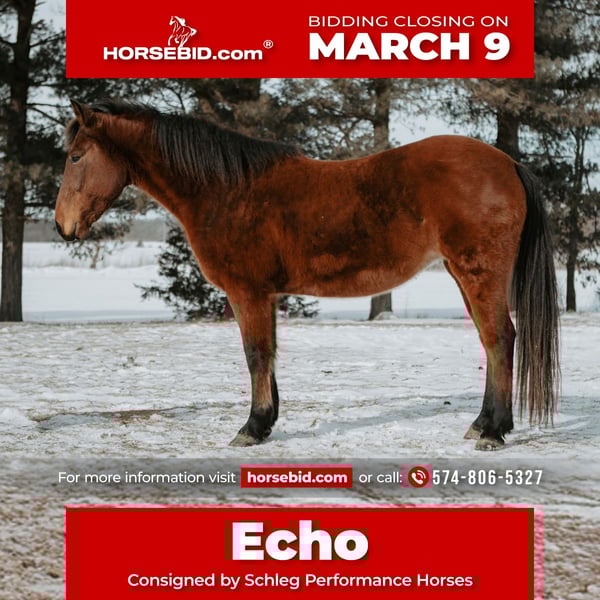 ℳ𝒶𝓇𝒸𝒽 ♦️𝐑𝐈𝐃𝐄𝐑'𝐒 𝐂𝐇𝐎𝐈𝐂𝐄♦️ Happening now thru MONDAY | MARCH 9th - Available EXCLUSIVELY on HorseBid's website! For more details and to register visit: www.Horsebid.com CONSIGNOR CONTACT: Schleg Performance Horses 574-806-5327 LOCATION: North Judson, IN BREED: Mustang REGISTERED: No REGISTERED NAME: Echo COLOR: Bay HEIGHT: 14.3 AGE: 10 GENDER: Mare Echo is a 10 year old mustang mare from Salt Wells Creek, WY. But don't let that make you shy away. Echo is incredibly sweet, loves to be with people. She was gentled as a 2 year old and has been rode since. Echo has lots of miles under her and it shows. Echo has been rode both western and English. She has been primarily used as a trail horse, but not just the walk tail to tail kind of trail riding. Echo is use to trotting and even loping down a trail when asked. Her incredibly smooth cadence makes trotting and loping on the trail or in an open field a breeze. Echo is comfortable riding in a small group of trail riders, a large group of trail riders and even out alone. She is not timid in new surroundings and is very use to being hauled and tied. In the spring, summer and fall Echo is rode in an outdoor arena when she is not out on the trails. In the winter and colder months, Echo is rode in an indoor arena. Echo has also been rode and English. Although she naturally wants to carry herself low and slow, she is very easy to keep in a more extended trot. She has been rode over ground poles and even low cross rails to jump. She was eager to go over the low cross rails and gave no issues. Echo is soft in your hands and soft on her sides. She naturally wants to carry herself low and sweep across the group. She moves off leg pressure with easy. She has a nice side pass, both directions and a nice little turn around both directions. Echo has very nice hip control and shoulder control as well. Because she is so soft and supple teaching Echo new things comes easy to her because she has all the foundation and button work done. Echo is easy to catch outside on the pasture or in a dry lot. She is an easy keeper. Her diet consists of free choice round bale with no extra grain or supplements when she is in the dry lot, and free choice alfalfa pellets with no extra grain or supplements when she is stalled. Echo is easy going with other horses out on pasture or in the dry lot with her. She is not a bully but she also doesn't let others bully her. She is usually right in the middle of the pecking order. Echo is a pro at tying, saddling, loading, bathing, ect. Echo has the right kind of mind and ride to fit a lot of different people and styles. She is easy going, not a horse that needs worked down on the lunge line before you can even ride, but one you can pull out, saddle and step right on. Echo sells 100% sound with no maintenance. For questions or to talk more about Echo to see if she is the right fit for you, give us a call. We are happy to help.
