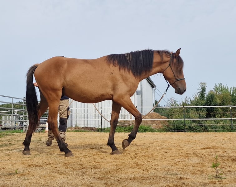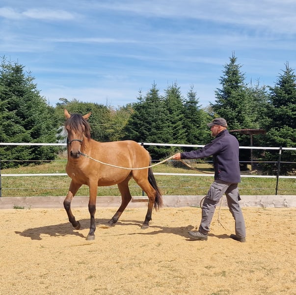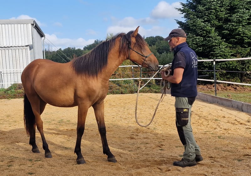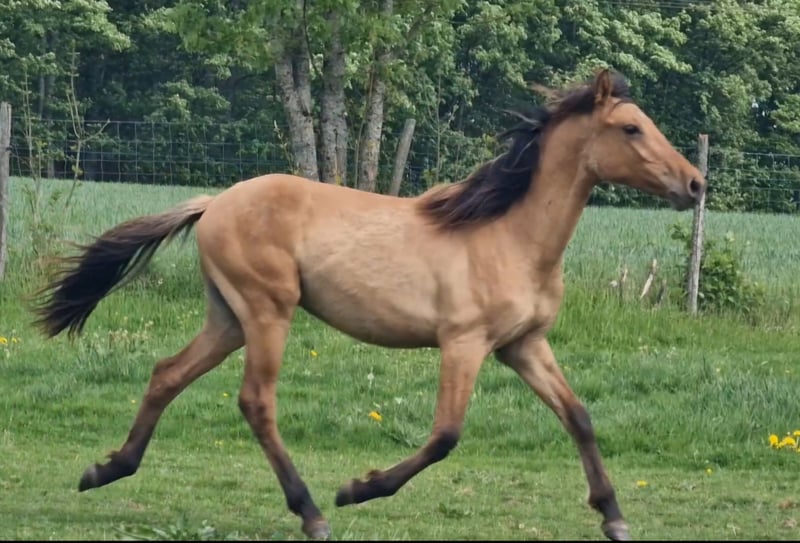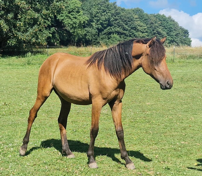 Aristeo was born on April 28, 2024. For his age, he is already very tall. We call him TEO, and he is friendly in handling, working appropriately for his age. He is growing up with other stallions. Daily play allows his muscles, endurance, lung capacity, and balance to develop. Additionally, the important social behavior is being trained. Teo has a red paper and could later act as a breeding stallion. He can happily stay with us for further rearing.