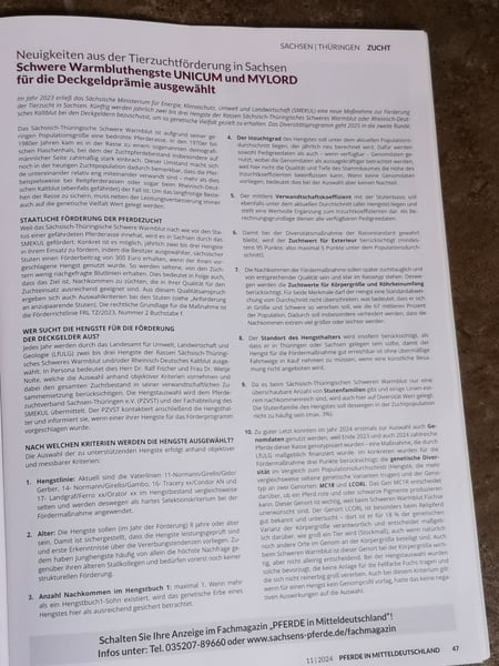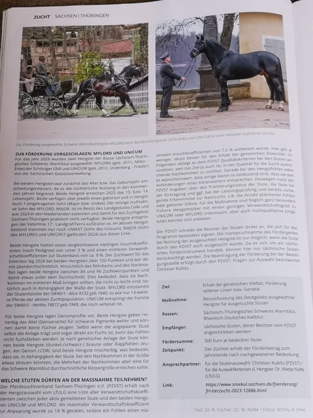 Die Hengste MYLORD und EXZELLENZ decken im Natursprung. Beide Hengste sind prämiert und vertreten die Attribute ihrer Rasse nach vorbildlichem Maßstab. Überdurchschnittlich gute Bewegungsabläufe und eine äußere Erscheinung ohne Fehl und Tadel. Beeindruckend ist die Gelassenheit, der Arbeitswille und die menschenfreundliche Art der Pferde. Prämienhengst MYLORD, dunkelbraun, geb. 2011, Bundeschampionat gelaufen, lebenslang anerkannt für Dänemark, Dressur bis Kl. M, Lehrmeister im Geschirr für Jungpferde im Zwei- bis Sechsspänner Neugebründer der M-Linie WH 165,0 cm, Röhrbein 22,5 cm 50-Tage-Test 2014 erfolgreich absolviert, Note 9,00 für Umgänglichkeit und Verhalten Mutter Alphe ist Prämienstute*** und bei der FN im Leistungsstutbuch 19 Championatsfohlen, 21 weitere in Championatsqualität (1a prämiert, aber nicht zum Championat vorgestellt) 10 Staatsprämienstuten, 8 Hengstanwärter, 1 Sohn gekört EXZELLENZ, schwbr., geb. 2023, von Ecksteins Eminenz - Lotus, in Moritzburg gekört und prämiert, ein kraftvoller, ausbalancierter Hengst mit größter Körperharmonie und stabilen Fundament. Für sein Wesen müsste er ein Extra-Sternchen bekommen. An seinen Fohlen bekunden wir großes Kaufinteresse! https://www.g-e-h.de/rassebeschreibungen/45-pferde/588-saechs-thuering-schw-warmblut für weitere Informationen bitte die Texte auf den Fotos vergrößern Unterbringung von Stuten möglich Besichtigung nahezu jederzeit möglich. Bitte vorher kurz anrufen, Tel. s.u. Für Spätentschlossene: Präsentation der Hengste zur Stutbucheintragung am 12. Mai 2026 in Ellefeld Decktaxe 350,00 Euro Fragen Sie nach unserem Rabatt für Prämienstuten! Schöniger-Pfer.de RFV Ellefeld Jahnstraße 14 08236 Ellefeld Tel. 03745 6438 (Arndt) 015253222116 (Philipp) 017672152448 (Gunter)