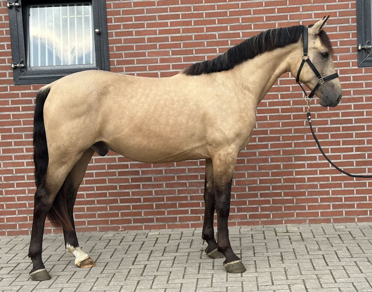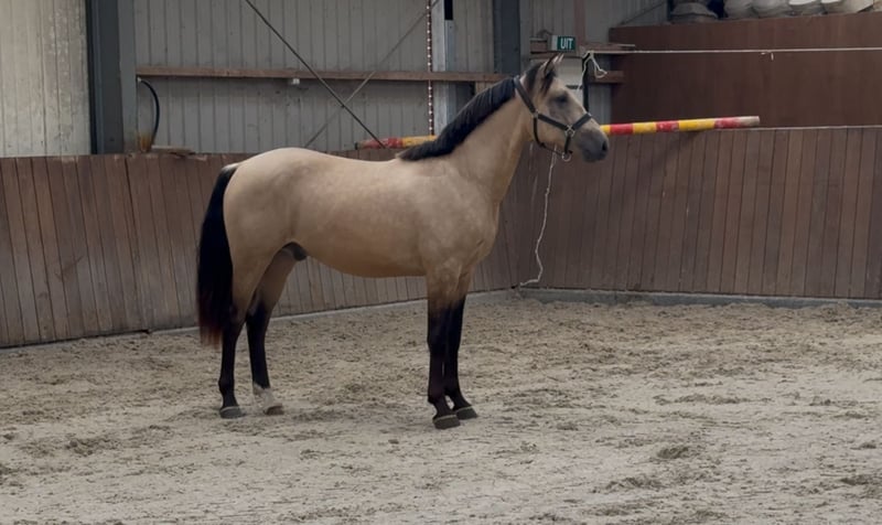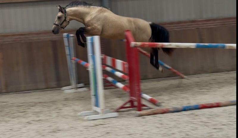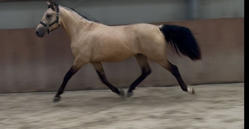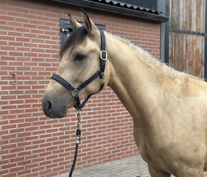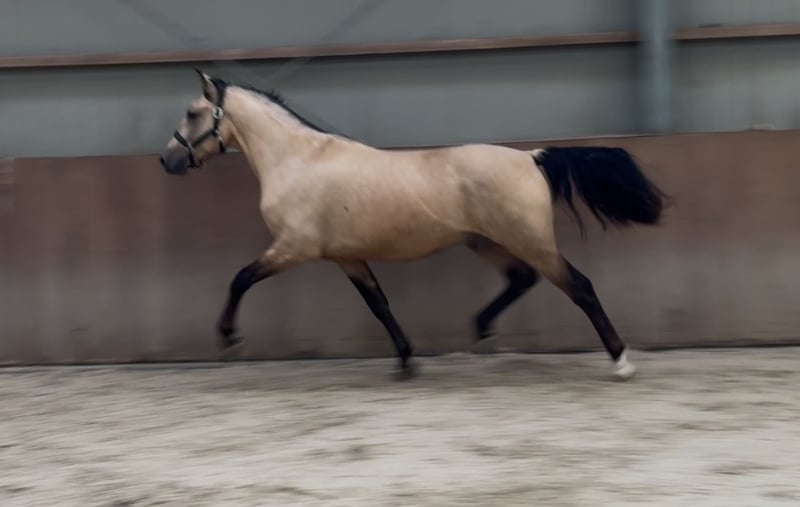 Tribunolas is a very beautiful specimen. Not only because of his lovely color, but also due to his appealing type and appearance. He currently stands at a height of 1.53m. He possesses three good basic gaits. He moves with great suppleness and good leg technique. He can also naturally change leads easily. His first free jumps are promising. He shows a lot of athletic ability. He jumps with quick reflexes and good technique, consistently finishing well behind the jump. He was castrated about 6 weeks ago. Tribunolas has not yet been backed. However, he is honest in handling and has a curious and level-headed character. Please call or message if interested. A video is available. Phone: +31(0)643197337