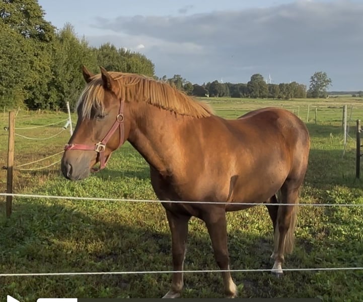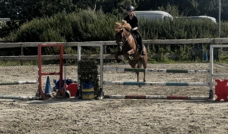 Our little one is looking for a new home. He loves to work hard, as he is not a lazy horse at all. He is absolutely well-behaved when tied up and on the lunge. He has just completed his first show jumping course, where he showed great potential over the jumps; he just needs a bit more routine and pulls nicely to the jump! I wouldn't classify him as a pure beginner pony; you should have some riding experience, as he is still young and really eager to work. He has been backed, enjoyed some time in the pasture, and is now back under saddle. I can easily imagine him as a leisure partner, but definitely also at competitions; he is a true all-rounder and is willing to try anything, especially when he trusts you. Father: Poppings Marribo, bay, 145 cm Mother: Jurina, dark chestnut, 145 cm